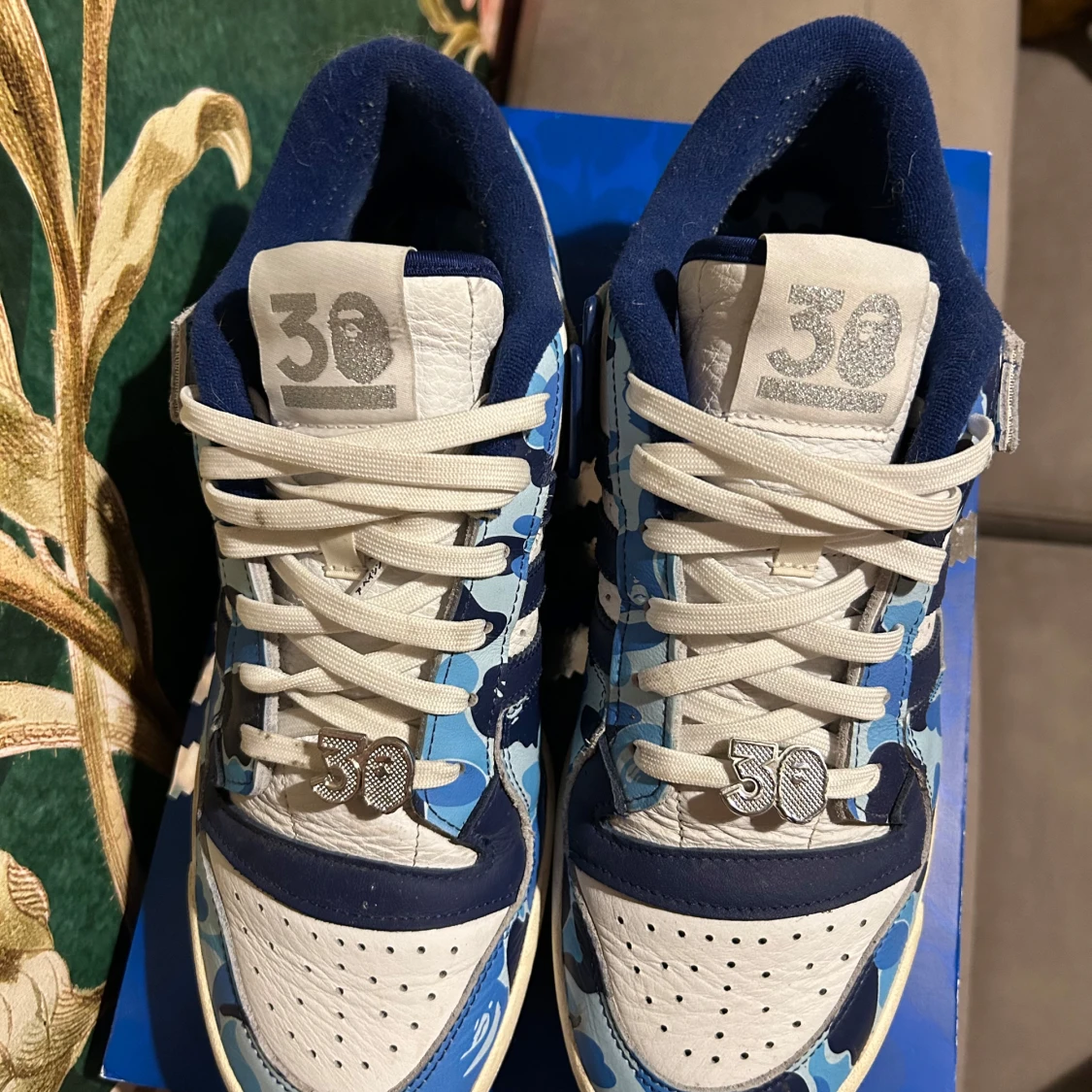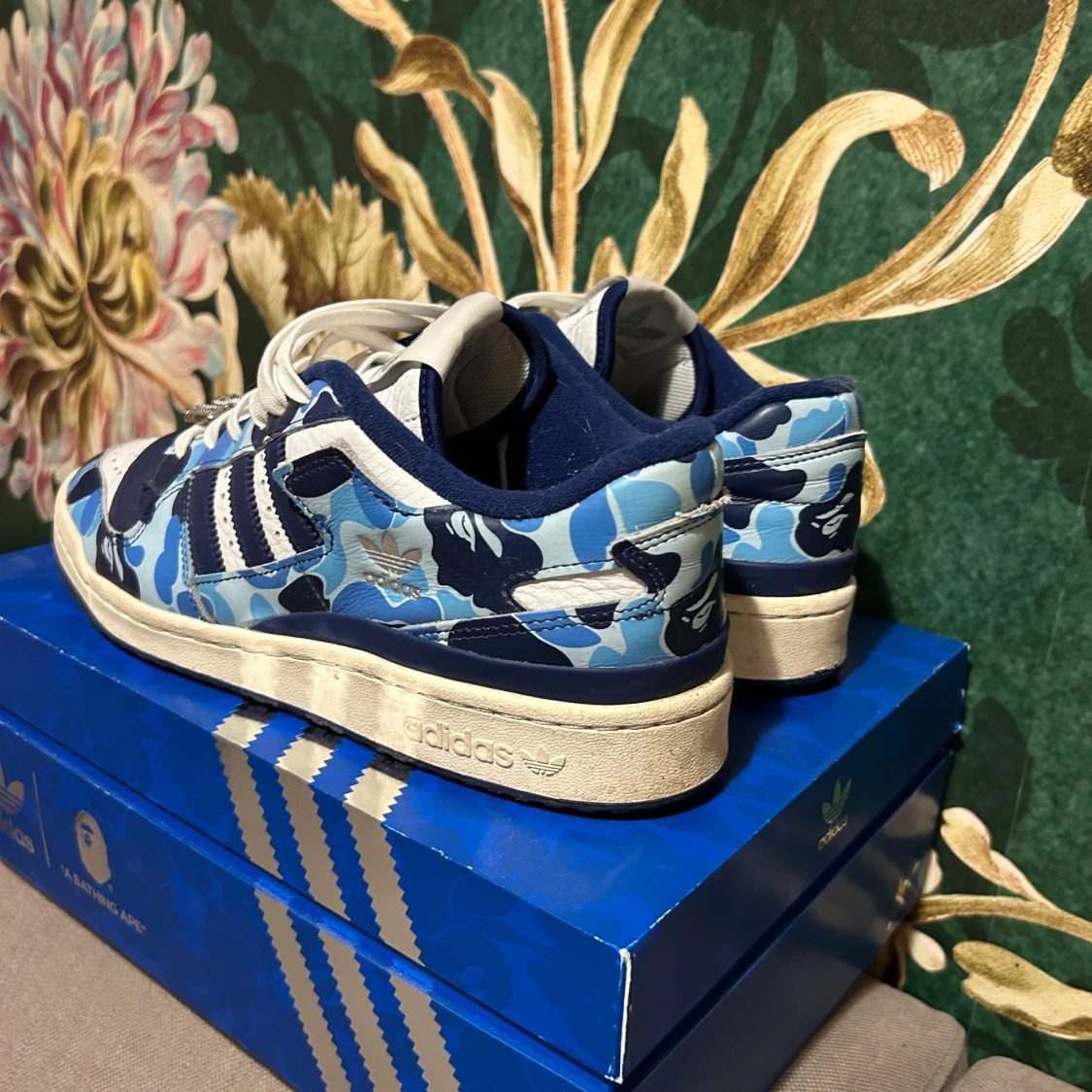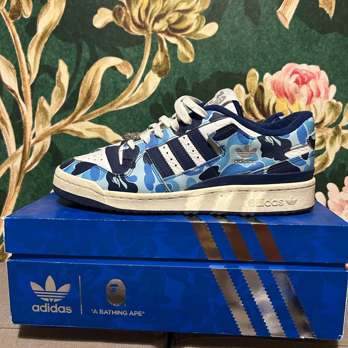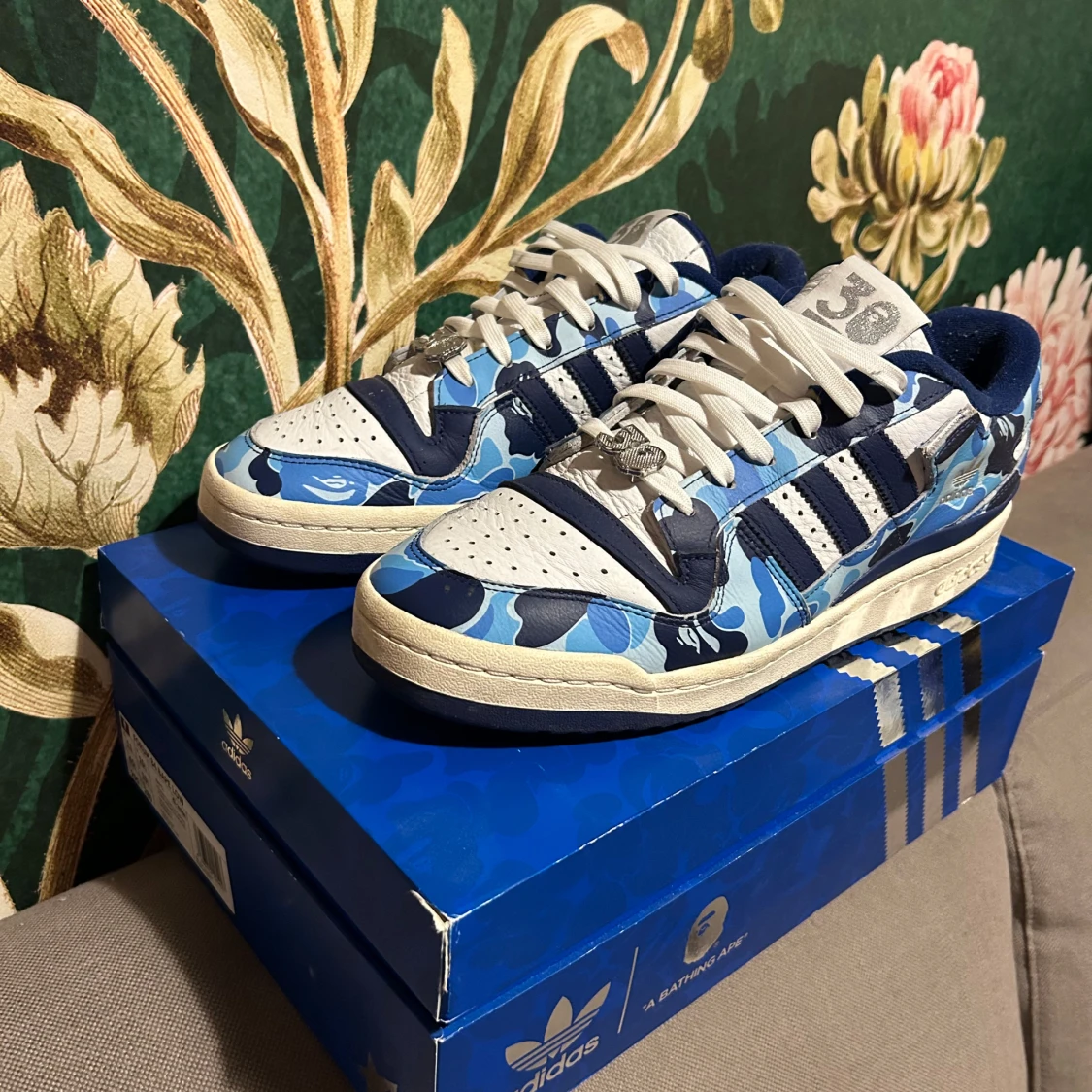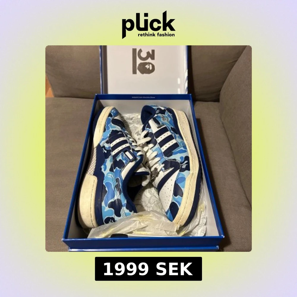 Snygga Adidas sneakers i samarbete med A Bathing Ape. Skorna har ett blått camouflage-mönster med vita och mörkblå . Storlek är 45 men skulle säja att dom sitter som 44.Ny pris är runt 3800