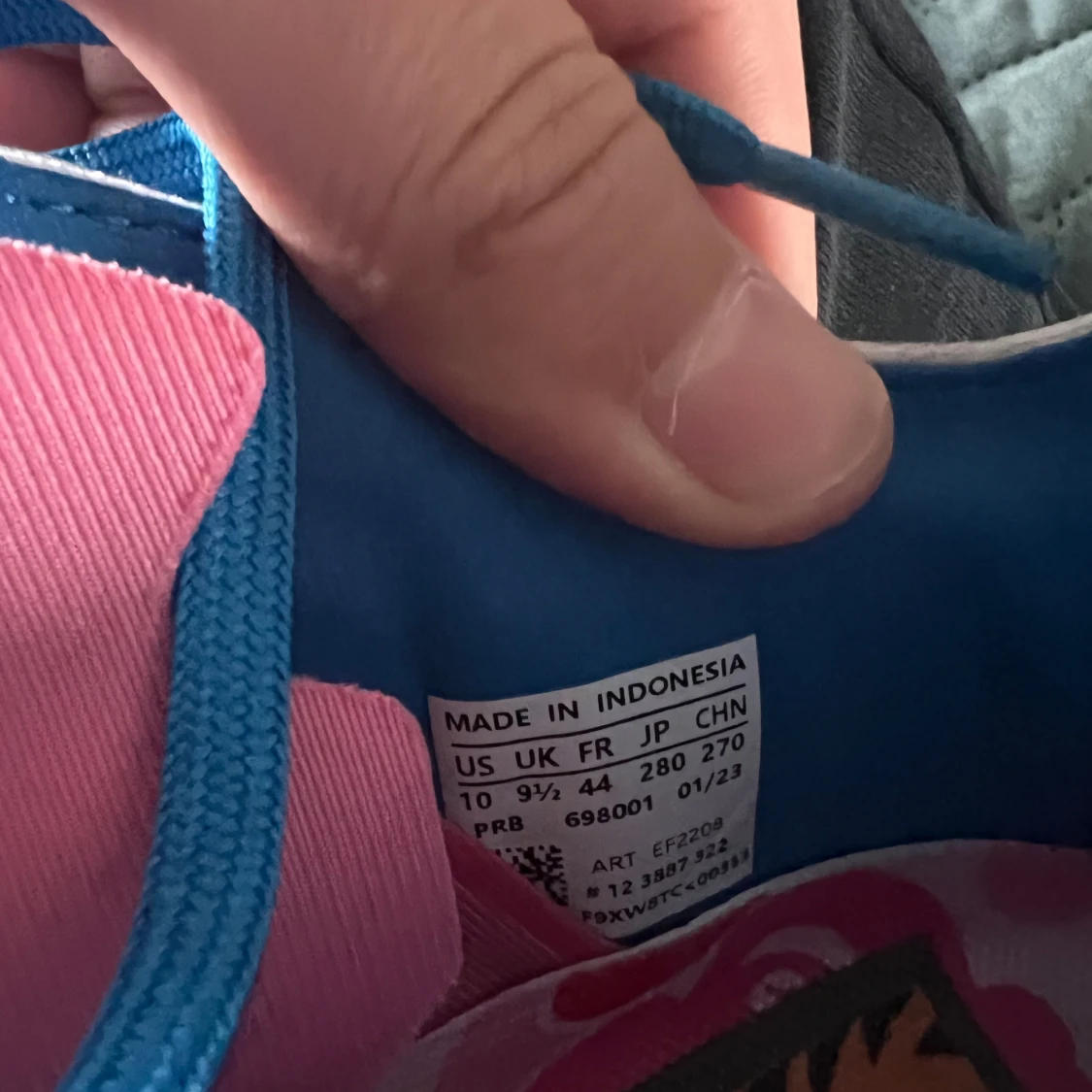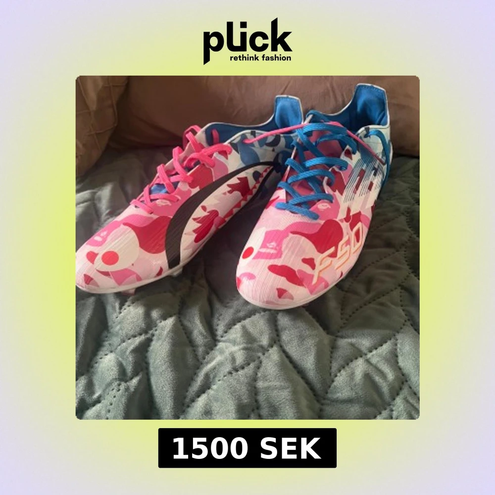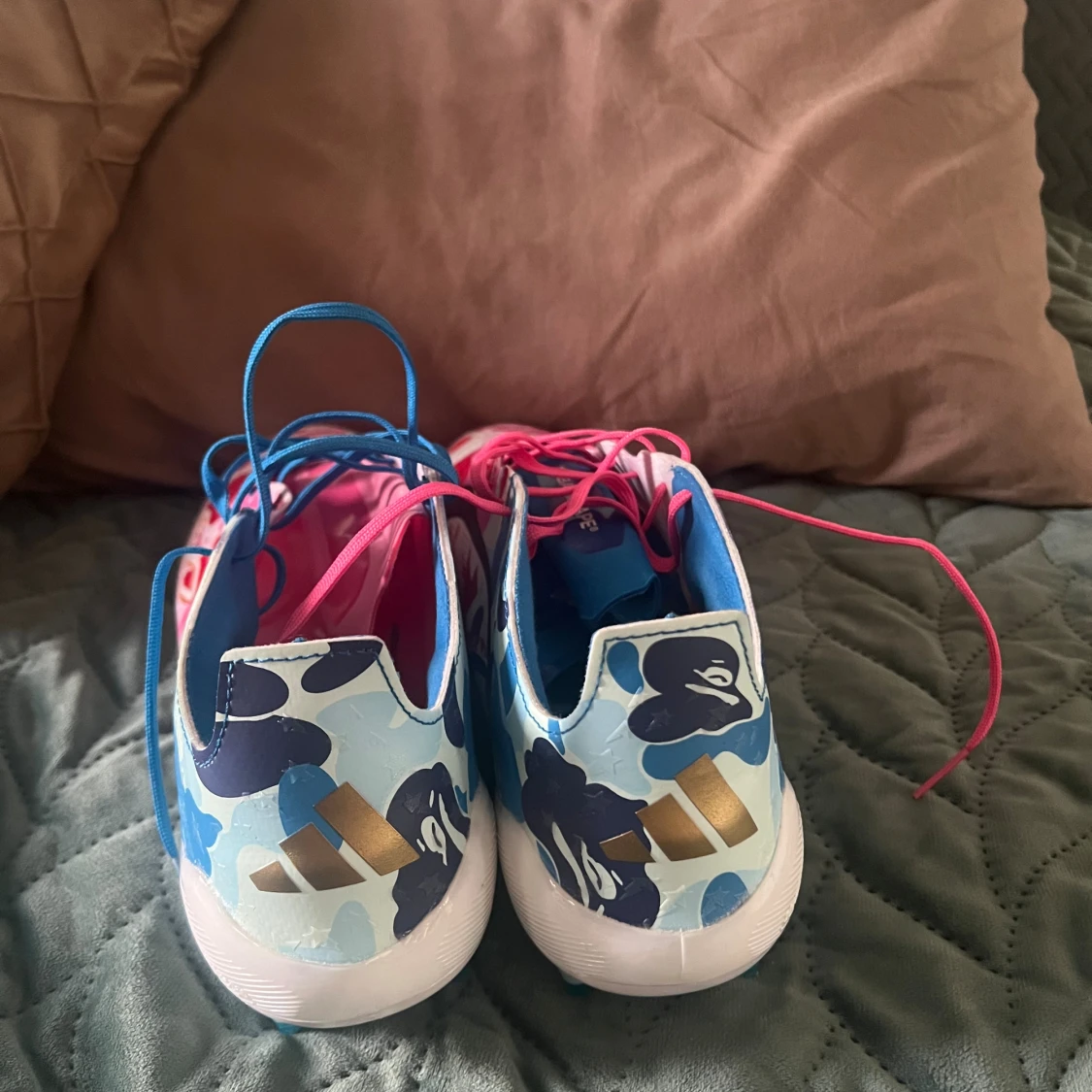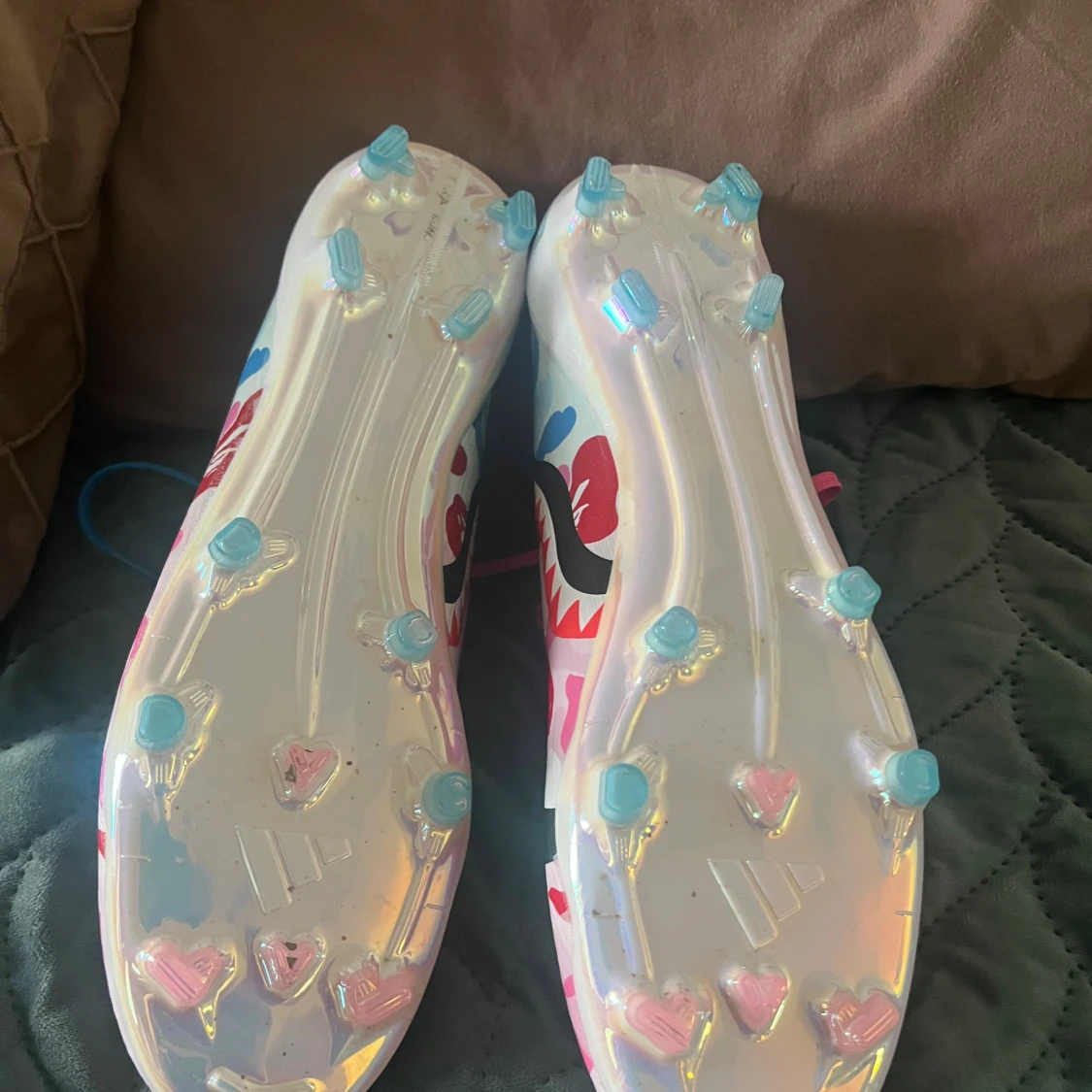 ÄNVÄNT BARA I 5-6 träningar.Unika Adidas F50 fotbollsskor med färgstarkt camo-mönster i rosa, blått och vitt. Ena skon har blå snören, den andra rosa. Snygga detaljer som hjärtformade dobbar och grafiska tryck. Skorna har platt sula och är tillverkade i syntetmaterial för bästa prestanda på planen.