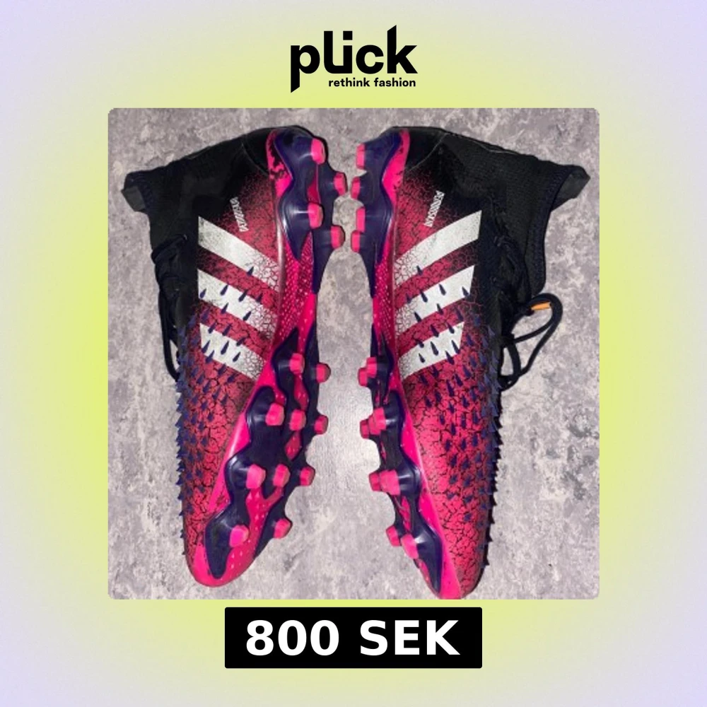 Säljer ett par Adidas Predator fotbollsskor med coolt rosa och svart mönster, silverfärgade ränder och taggiga detaljer på ovansidan. Skorna har snörning, hög ankel och platt sula med dobbar för bra grepp på planen. Perfekt för dig som vill sticka ut på matchen!
