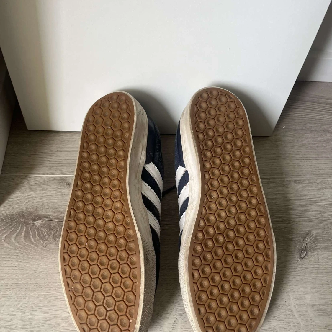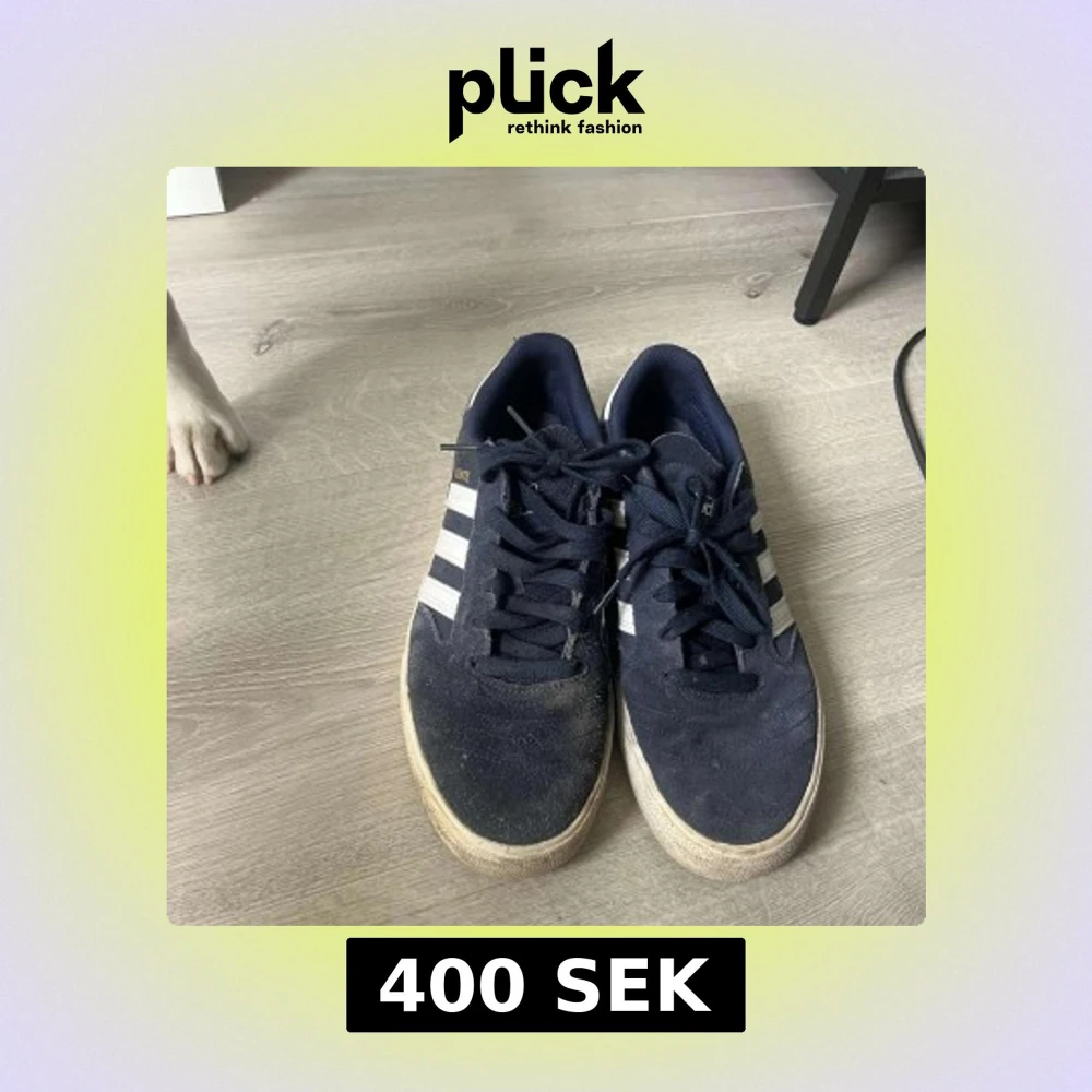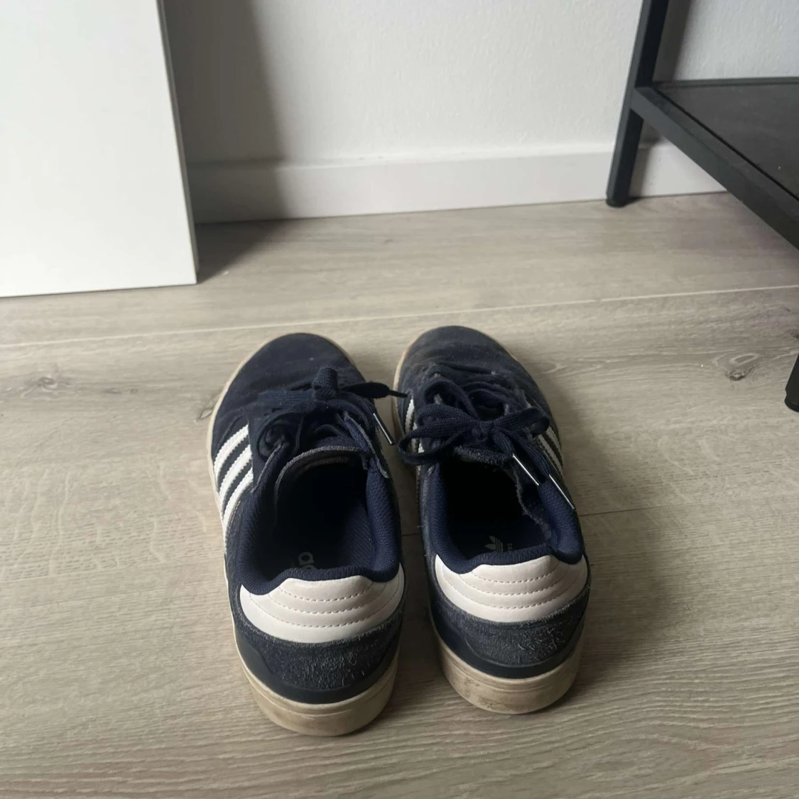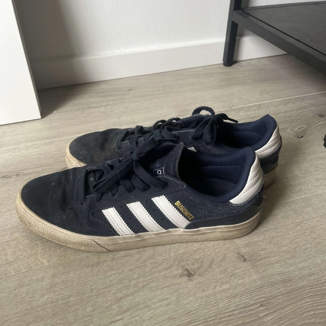Säljer ett par Adidas Busenitz sneakers i marinblå mocka med klassiska vita ränder på sidorna och vit häl. Skorna har snörning och en platt gummisula med hexagonmönster undertill. Perfekt för dig som gillar streetstyle och skate. Storlek 44 knappt använda