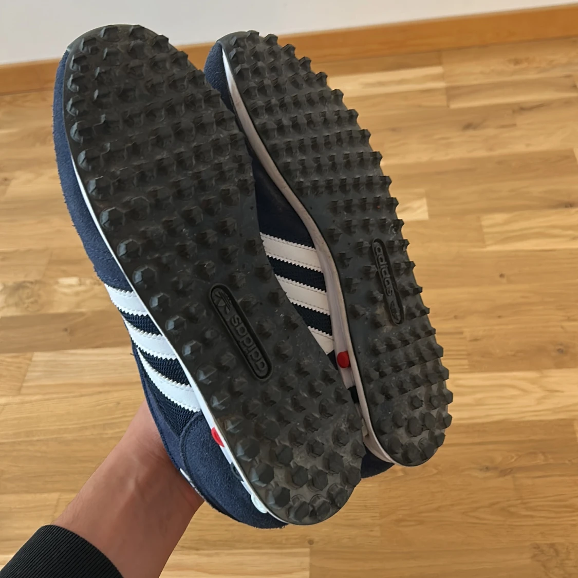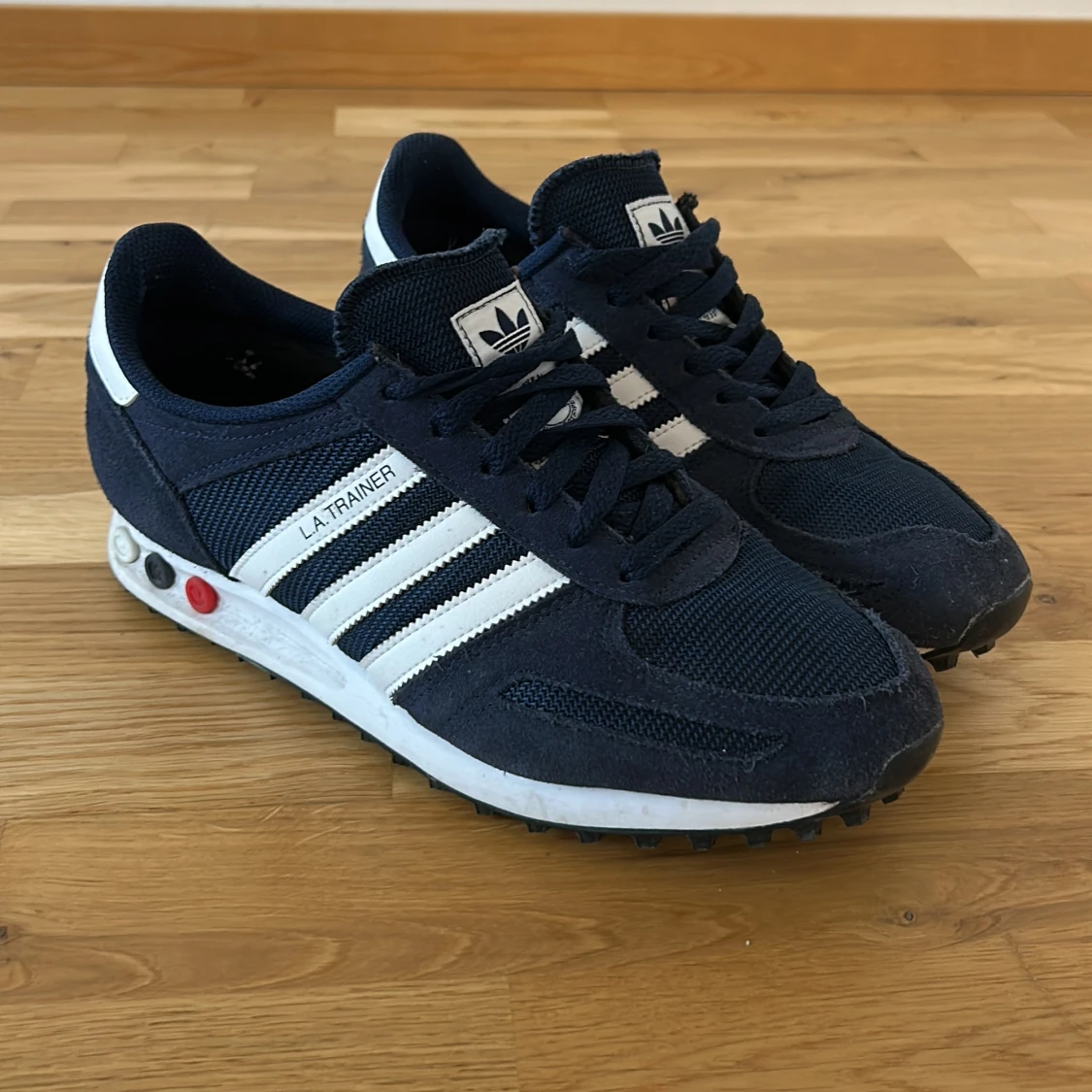 Snygga Adidas LA Trainer sneakers i marinblått med vita detaljer och klassiska tre ränder. Skorna är i bra skick och passar perfekt nu inför våren!