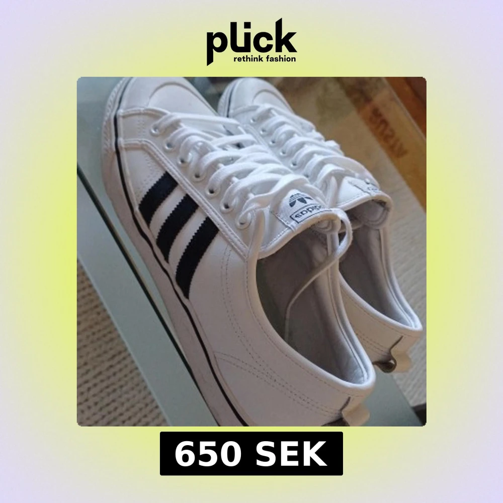 Säljer ett par fräscha Adidas Nizza sneakers i vitt med klassiska svarta ränder på sidorna. Skorna har snörning, platt sula och är tillverkade i syntetmaterial och textil. Perfekta för dig som gillar retrovibbar och stilren design.