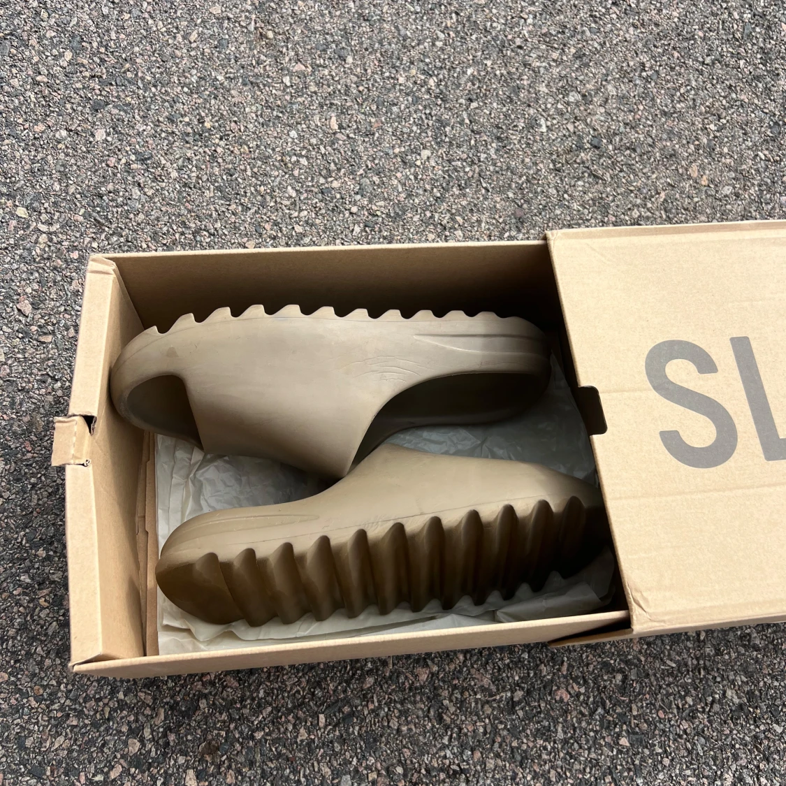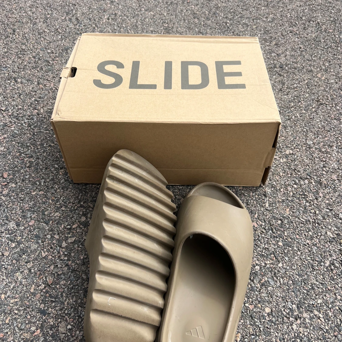 Säljer ett par Adidas Yeezy Slide i beige färg. Slidesen har en chunky, räfflad sula och är tillverkade i syntetmaterial för maximal komfort. Perfekta för chill dagar och har en stilren, minimalistisk look med öppen tå och bred rem. 44 1/2. Säljer billigt för vill bli av med dom, först till kvarn!