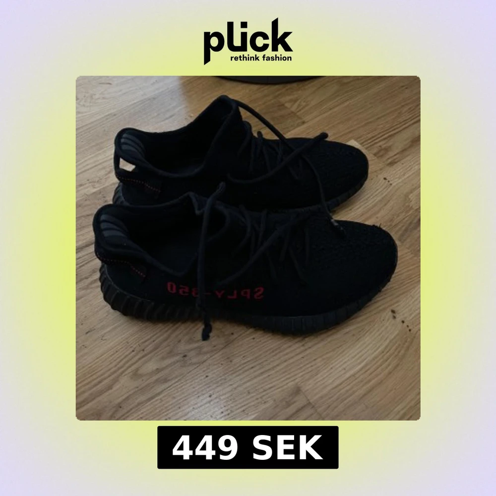 Yeezy 350 v2 boost med röd text på sidan. Skorna har en stickad ovandel och snörning för en bekväm passform. Yttersulan är designad för bra grepp och komfort.