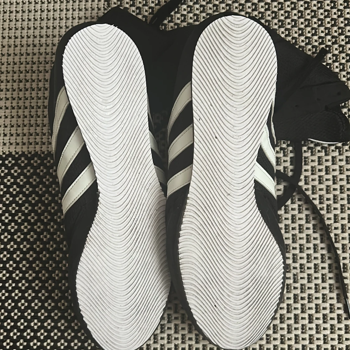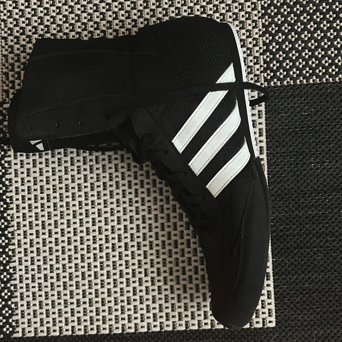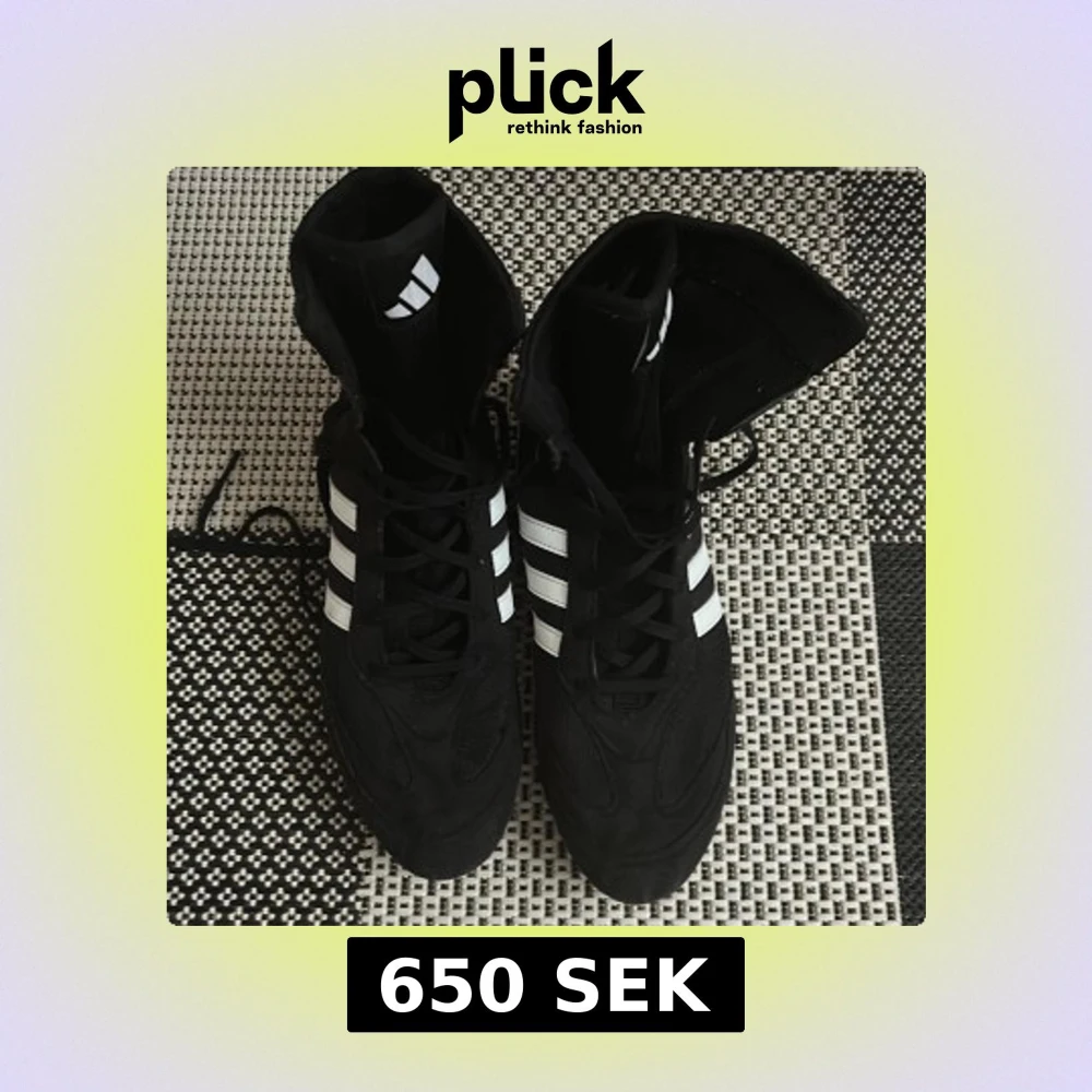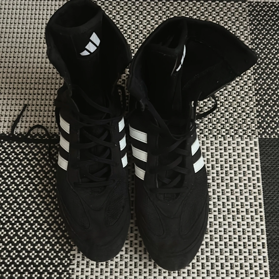 Säljer ett par svarta Adidas boxningsskor med klassiska vita ränder på sidorna. Skorna har hög modell, snörning och platt vit sula med vågmönster för extra grepp. Materialet är syntet och mesh för lätthet och ventilation. Perfekt för dig som vill ha stil och funktion i ringen.