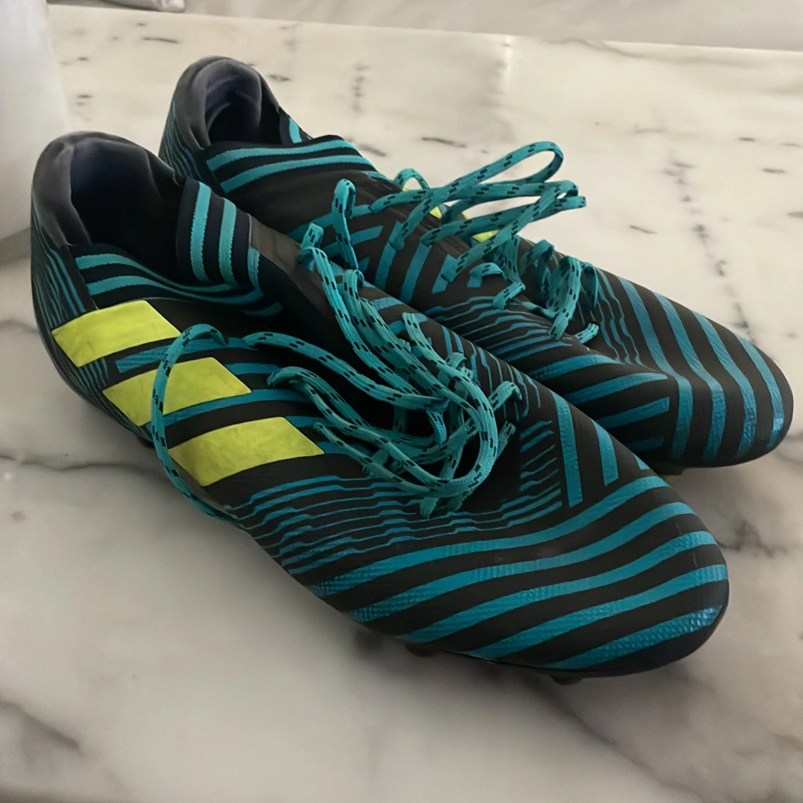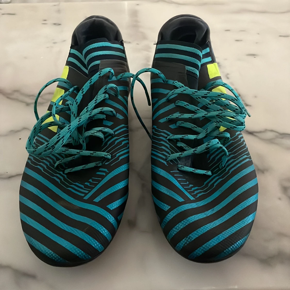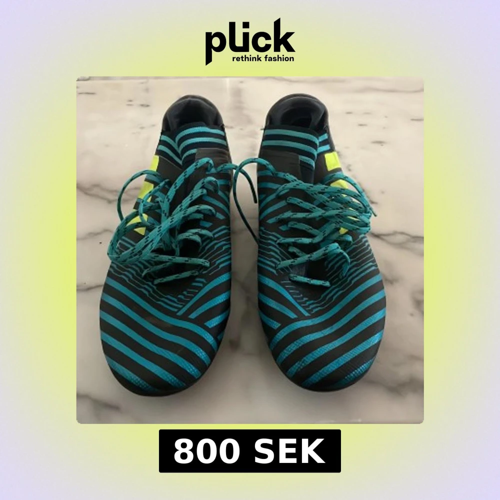 Snygga Adidas fotbollsskor med ett randigt mönster i blått och svart. Skorna har snörning och gula detaljer på sidorna. Perfekta för fotbollsplanen med sina dobbar för bra grepp. Messi skor gamla og riktigt feta