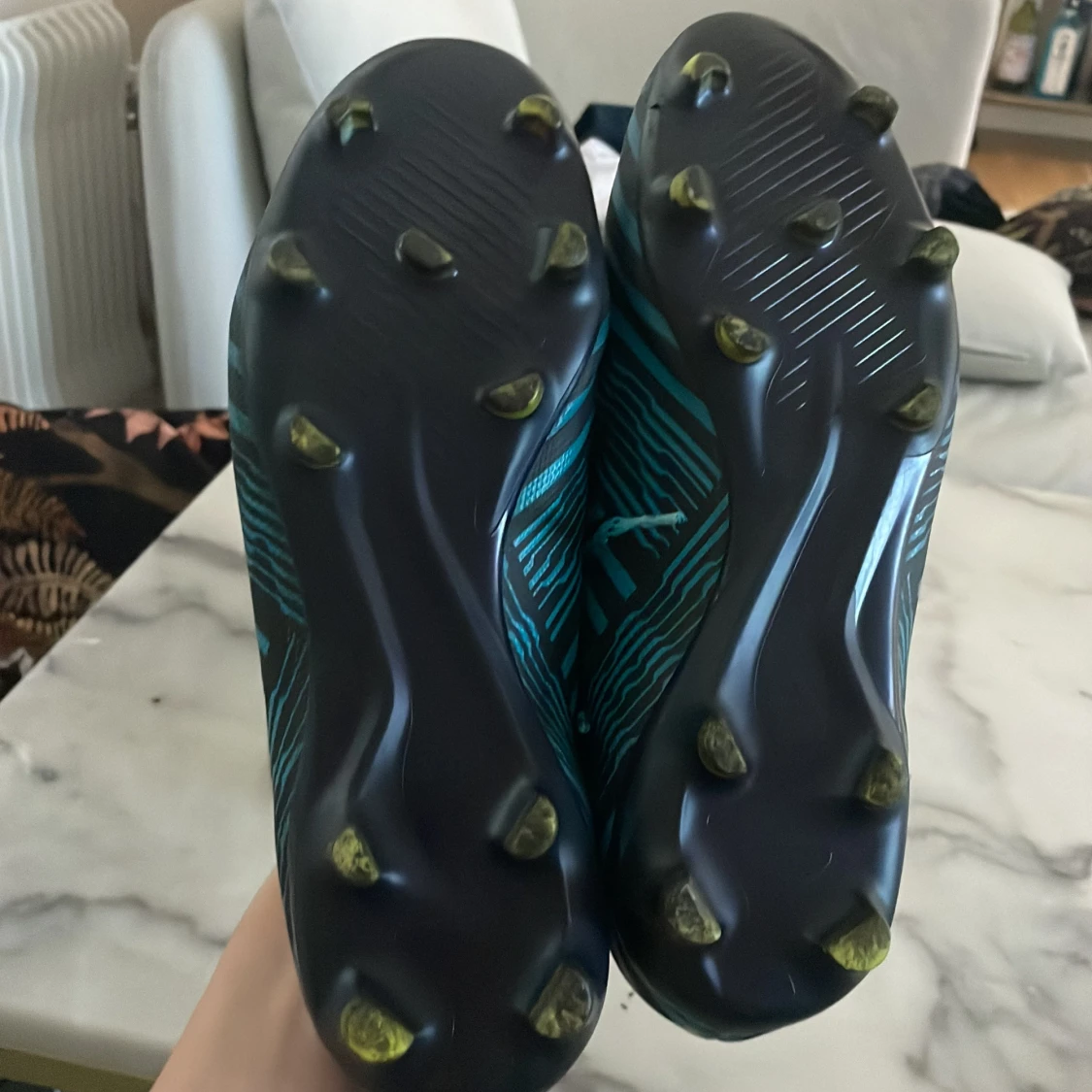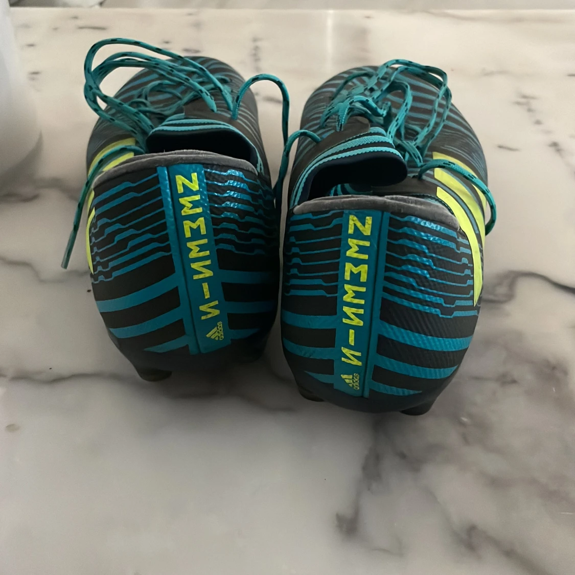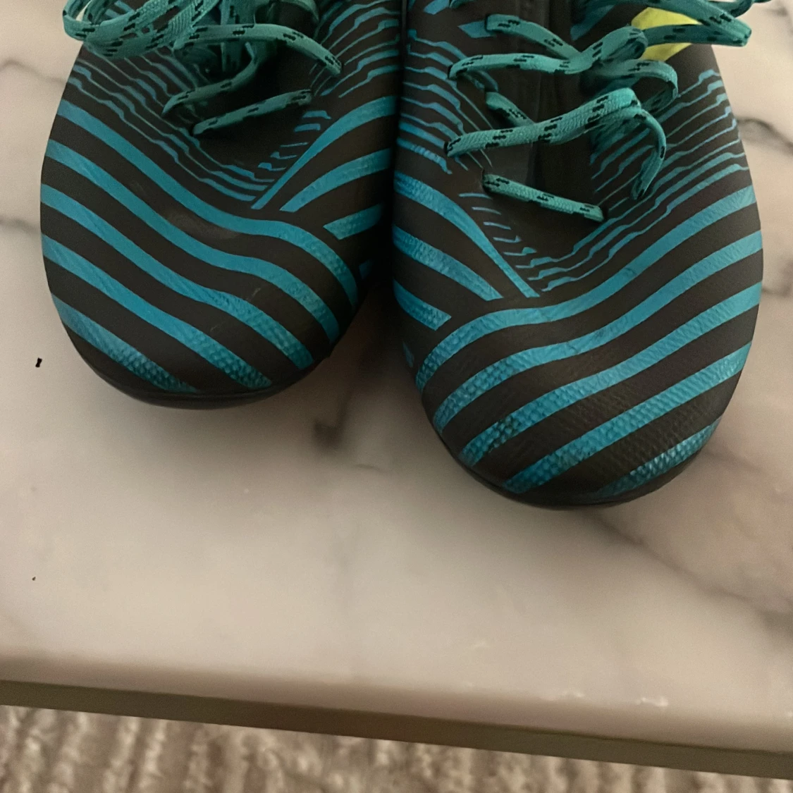 Snygga Adidas fotbollsskor med ett randigt mönster i blått och svart. Skorna har snörning och gula detaljer på sidorna. Perfekta för fotbollsplanen med sina dobbar för bra grepp. Messi skor gamla og riktigt feta