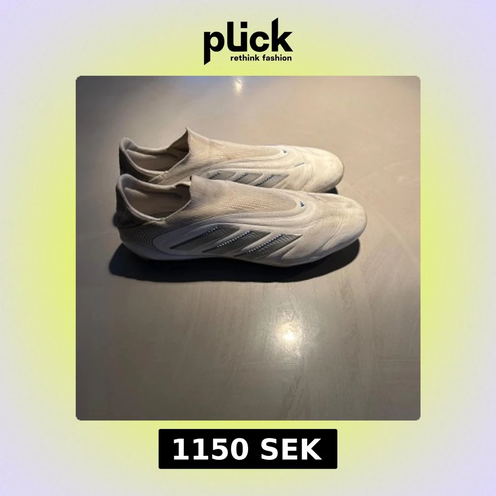 Snygga vita fotbollsskor från adidas med stilrena blå detaljer och klassiska tre ränder på sidorna. Skorna har en strömlinjeformad design utan snörning och är tillverkade i syntetmaterial för en tight passform och bra bollkontroll. Använda max 10 gånger följer även med påse till skorna. Nypris ca 2500kr köpta på unistore för 2 månader sedan.