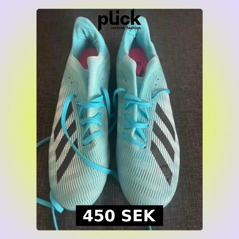 turkosa Adidas fotbollsskor med svarta ränder på sidorna och vita dobbar undertill. Perfekta för dig som vill sticka ut på planen.