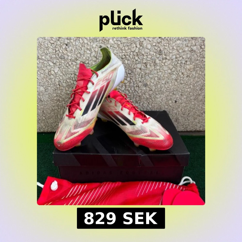 Säljer ett par Adidas F50 fotbollsskor i rött, vitt och svart med gula detaljer. Skorna har snörning, låg profil och är tillverkade i syntetmaterial för lätt känsla på planen. Medföljer originalpåse och extra innersulor. Perfekta för dig som vill sticka ut på fotbollsplanen. De går och spela med men bara att de behövs och limma på topen av den. Inget annan stans är de. De kommer med allt.