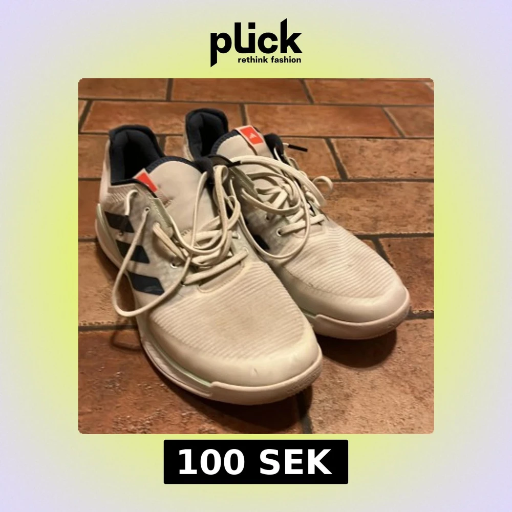 Säljer ett par fräscha vita Adidas sneakers med klassiska svarta ränder på sidorna och orange detalj på plösen. Skorna har snörning, platt sula och är tillverkade i syntetmaterial med mesh och skinnliknande detaljer. Perfekta för träning eller sportiga outfits.