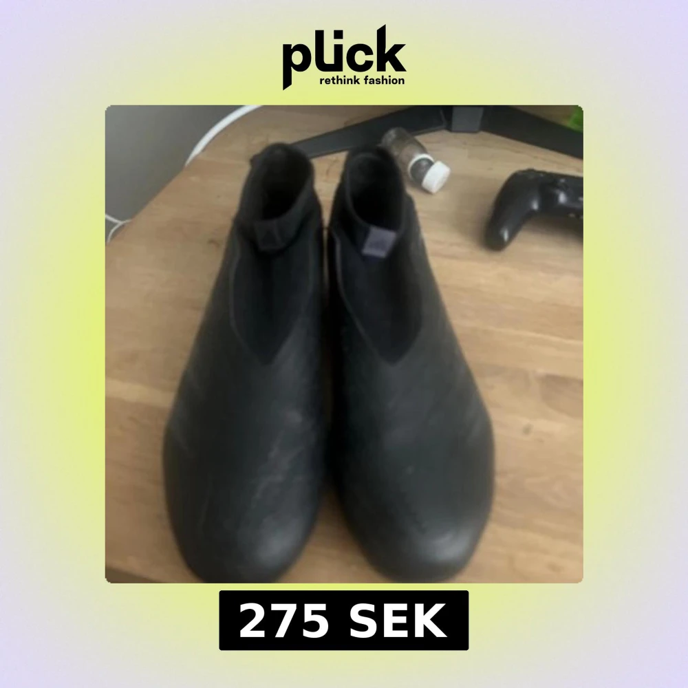 Säljer ett par svarta Adidas Predator fotbollsskor med klassisk design och diskreta ränder på sidan. Skorna har rund tå, platt sula med fasta dobbar och är tillverkade i syntetmaterial. Perfekta för dig som vill dominera på planen.