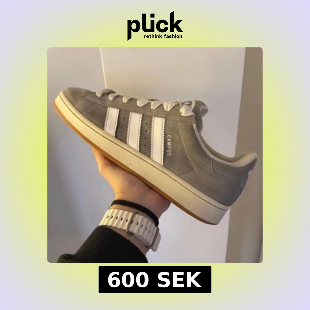 Säljer ett par grå Adidas Campus sneakers med vita ränder och gummisula. Skorna har klassisk låg profil, rund tå och är tillverkade i mocka med vita detaljer och snörning. Perfekta för en stilren vardagslook.