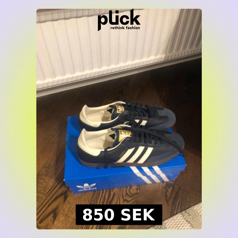 Adidas Samba sneakers i marinblått och vitt med klassiska tre ränder på sidan, guldiga detaljer på tungan och texten 'SAMBA' i guld. Ovandel i skinn och mocka, platt brun gummisula och snörning. Aldrig använda. De är i storlek US 13, och är i EU 48. Däremot mycket små i storleken så passar nog 46-47. Helt nya, med låda. Skriv vid frågor