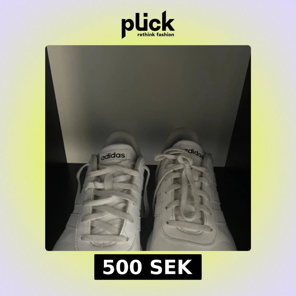 Säljer ett par klassiska vita sneakers från Adidas med snörning och diskret logga på hälen och plösen. Skorna har en platt sula och är tillverkade i syntetmaterial. Perfekta för en stilren och sportig look.