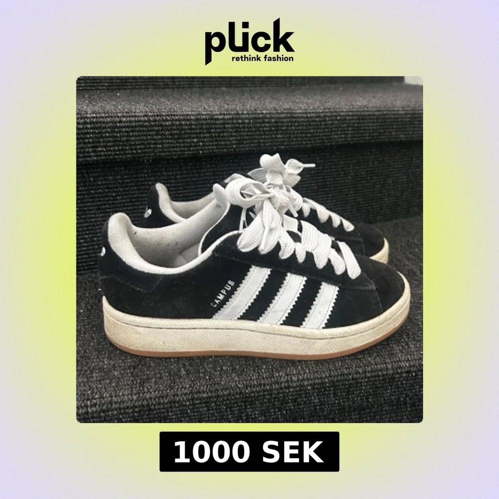 Klassiska svarta Adidas Campus sneakers med vita ränder och vit sula. Skon har en låg profil, rund tå och är tillverkad i mocka med tydliga vita snören. Perfekt för dig som gillar en stilren och tidlös look. Använda 5 gånger