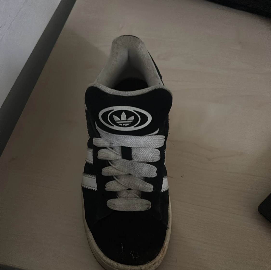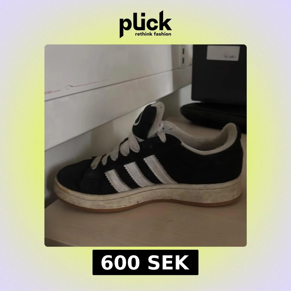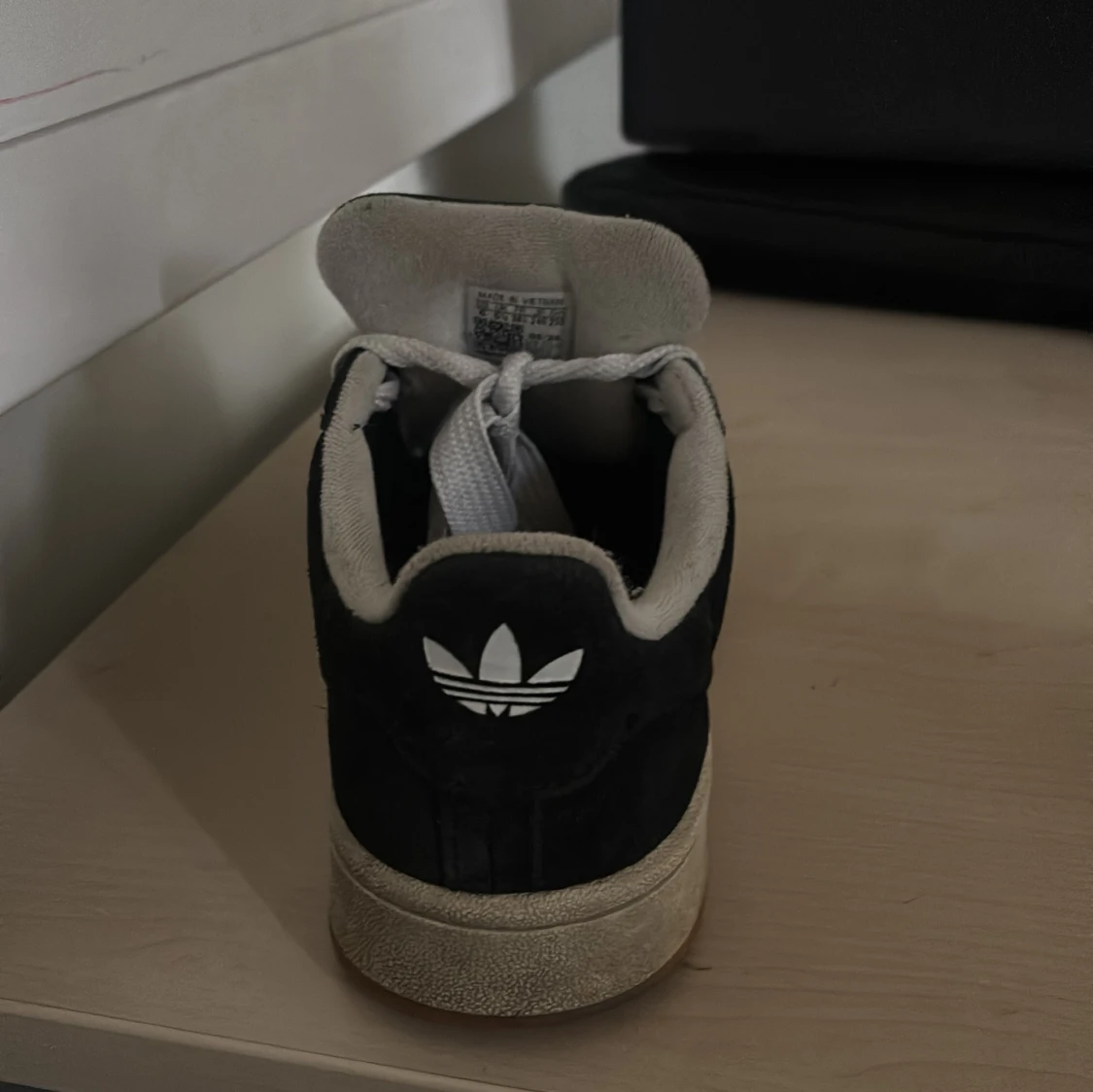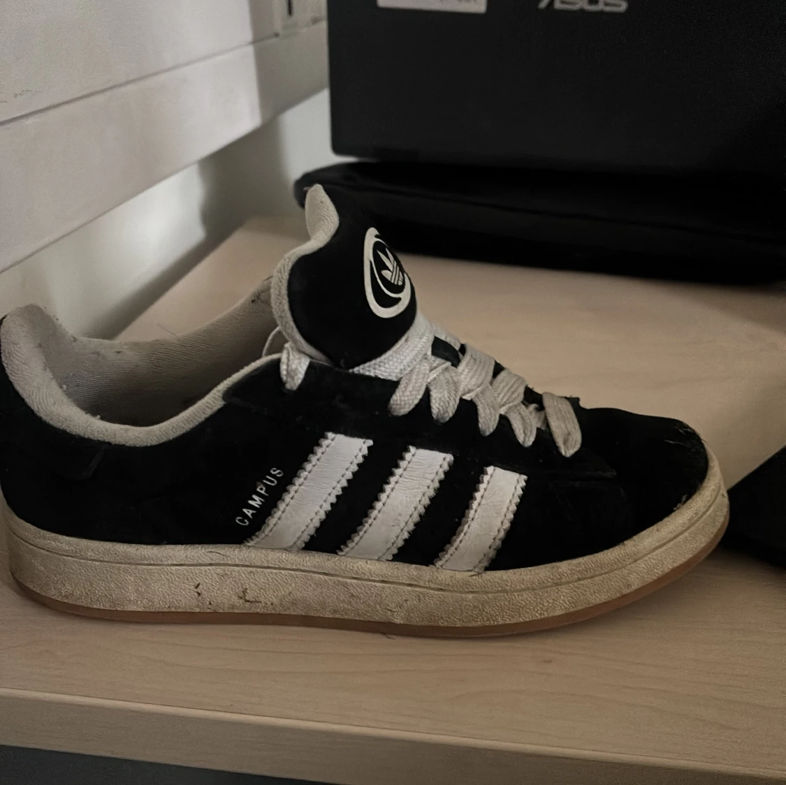 Svarta Adidas Campus sneakers med klassiska vita ränder på sidorna och vit Adidas-logga på hälen och plösen. Skorna har snörning och en platt sula i gummi. Ovandelen är i mocka och insidan är ljusgrå. Perfekt för dig som gillar retrostil och streetwear.