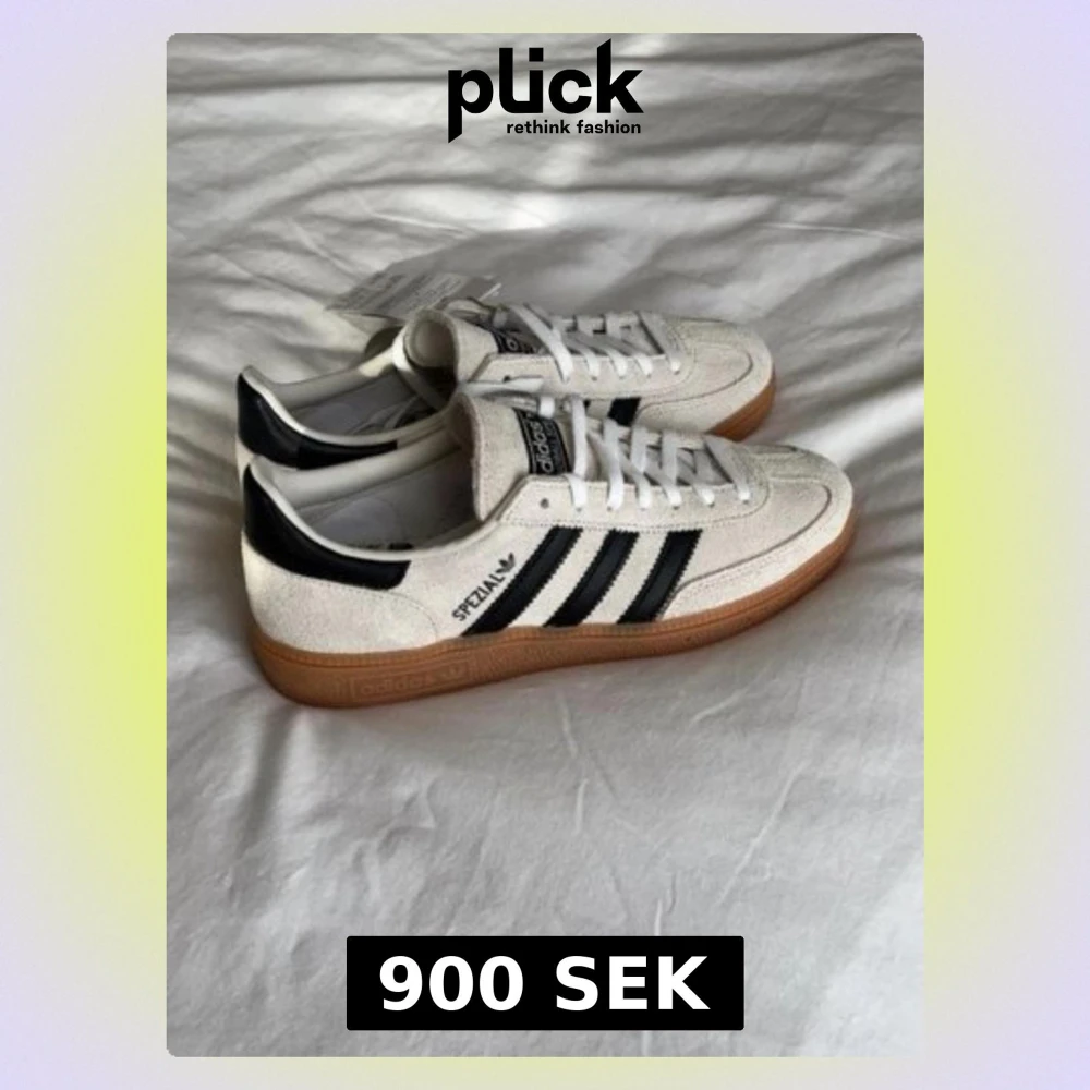 Adidas Spezial sneakers i beige mocka storlek 41 med svarta ränder på sidan. Skorna har en brun gummisula, snörning och rund tå. Dessa är även engångsanvända😊