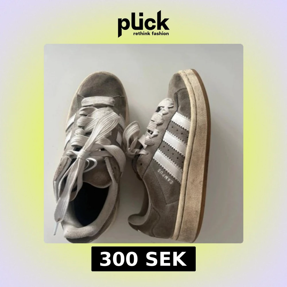 Snygga Adidas Campus sneakers i grå mocka med vita klassiska ränder och vit sula. Skorna har rund tå, platt sula och snörning. Perfekta för dig som gillar retrostil och streetwear. Storlek 36,5 (EU).