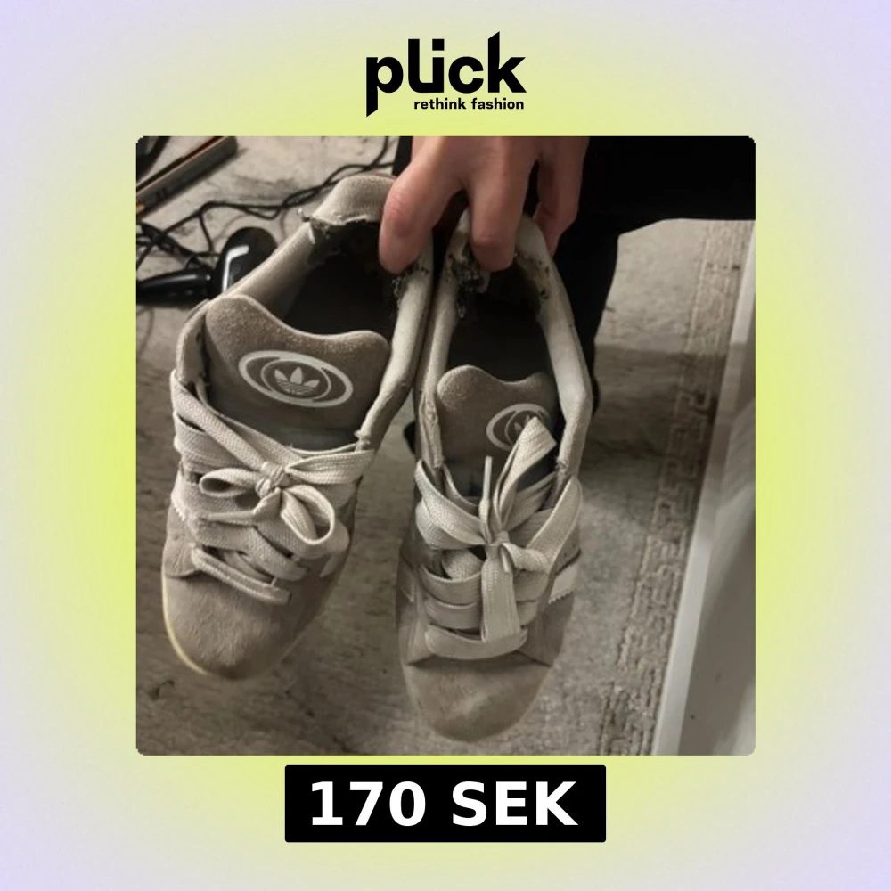 Säljer ett par grå Adidas Campus sneakers i grå med klassiska vita ränder på sidorna och vit logga på plösen. Skorna har breda vita snören och en platt sula i beige. Perfekt för dig som gillar retrostil och streetwear.