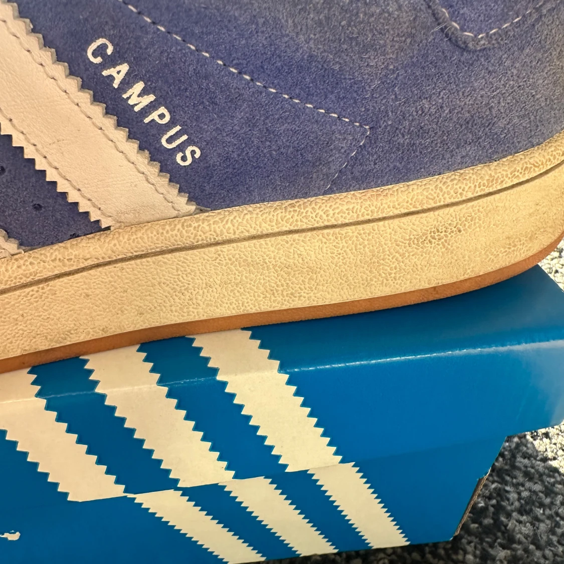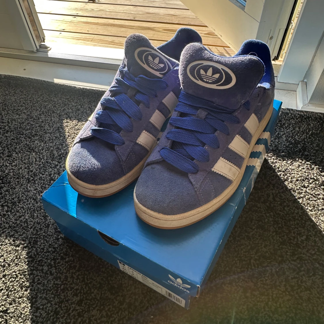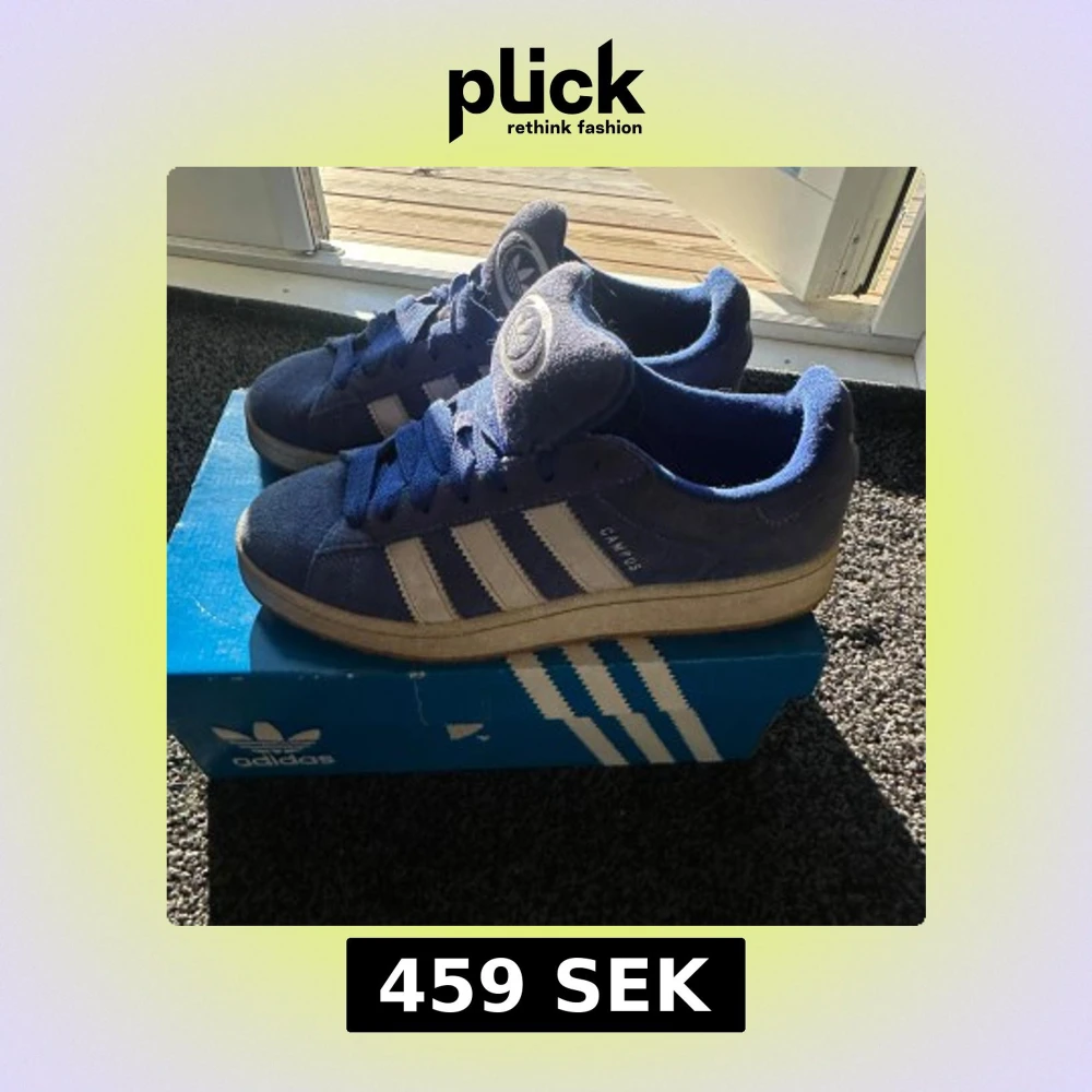 Säljer ett par Adidas Campus sneakers i blå mocka med vita klassiska stripes och logga på plösen. Skorna har platt sula, rund tå och snörning. Perfekta för dig som gillar retrovibbar och streetstyle. Storlek 43 1/3 (EU).