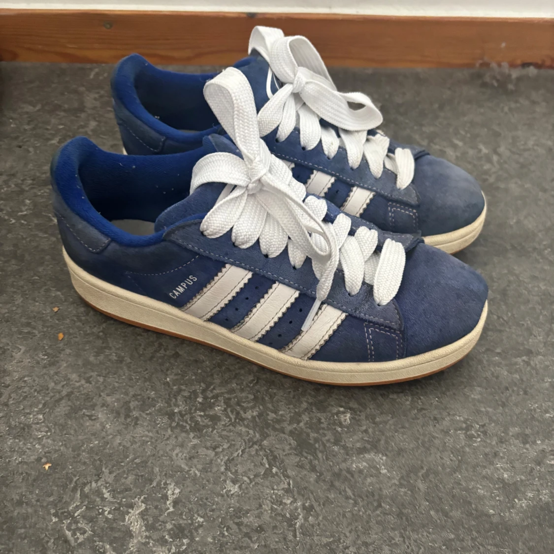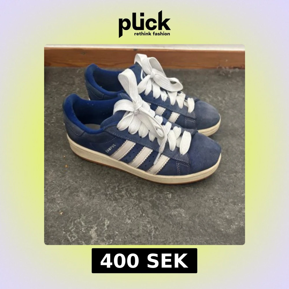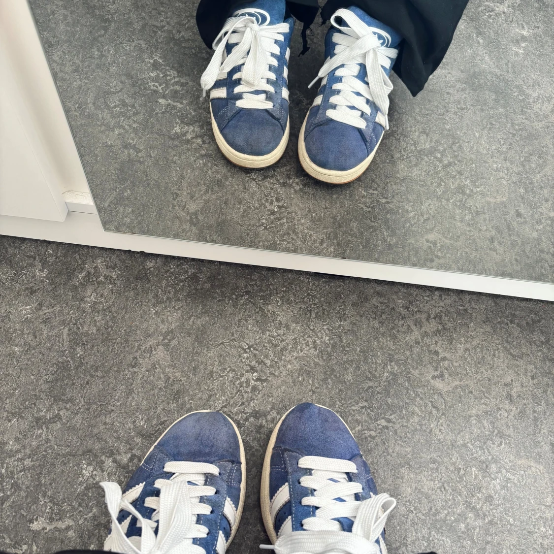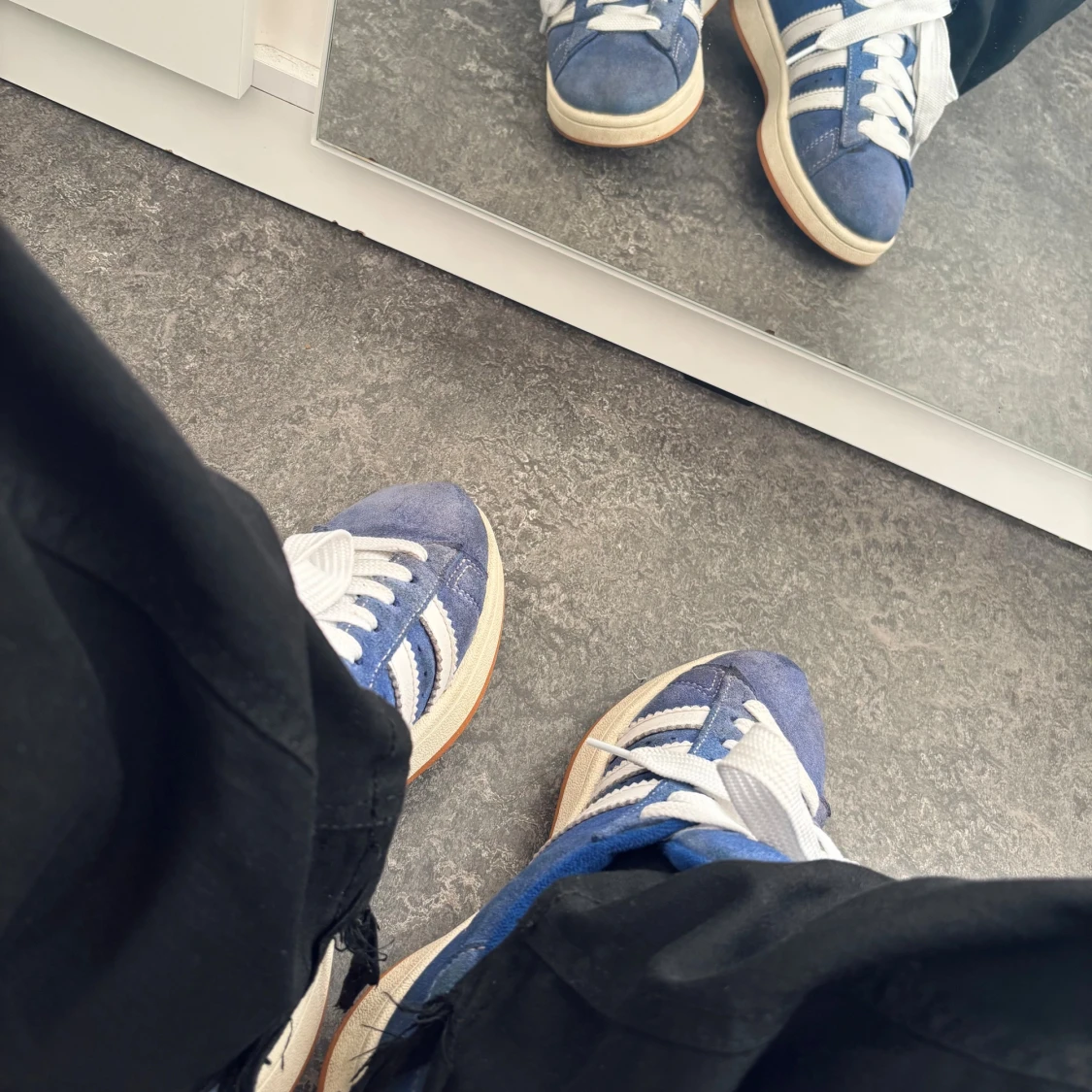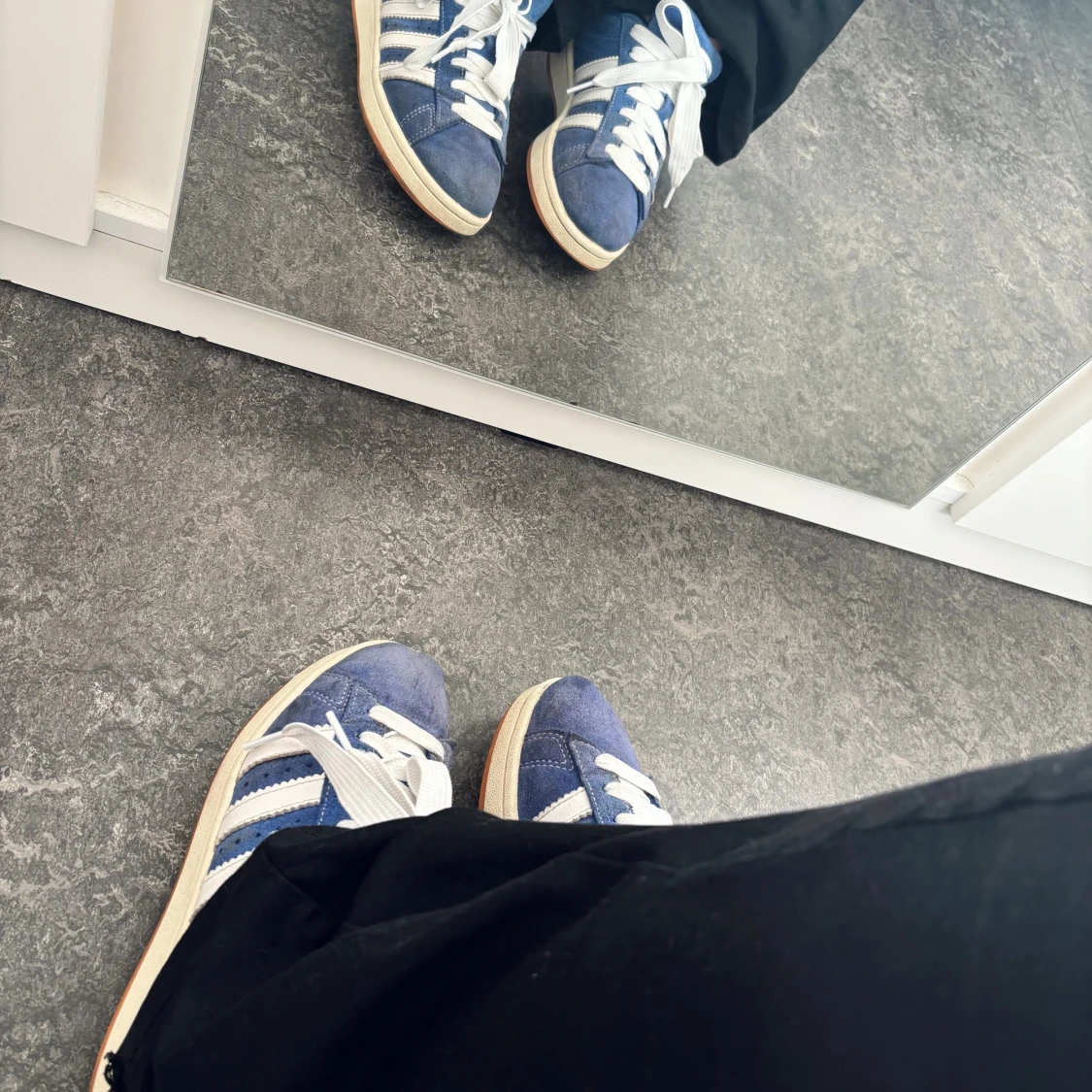 Säljer ett par klassiska Adidas Campus sneakers i blå mocka med vita ränder och vit sula. Skorna har rund tå, platt sula och vita snören. Perfekta för dig som gillar retrostil och vill ha något som sticker ut lite extra.