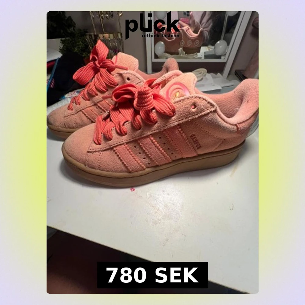 Säljer ett par Adidas Campus sneakers i en snygg ljusrosa färg med matchande breda rosa snören och klassiska tre ränder på sidan. Skorna är i mocka med gummisula i beige och har en rund tå. Perfekta för dig som vill sticka ut med färg på fötterna!