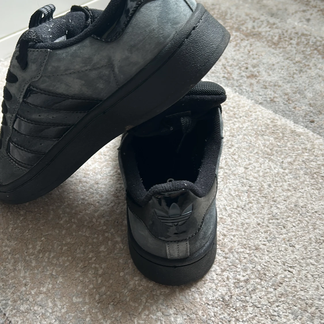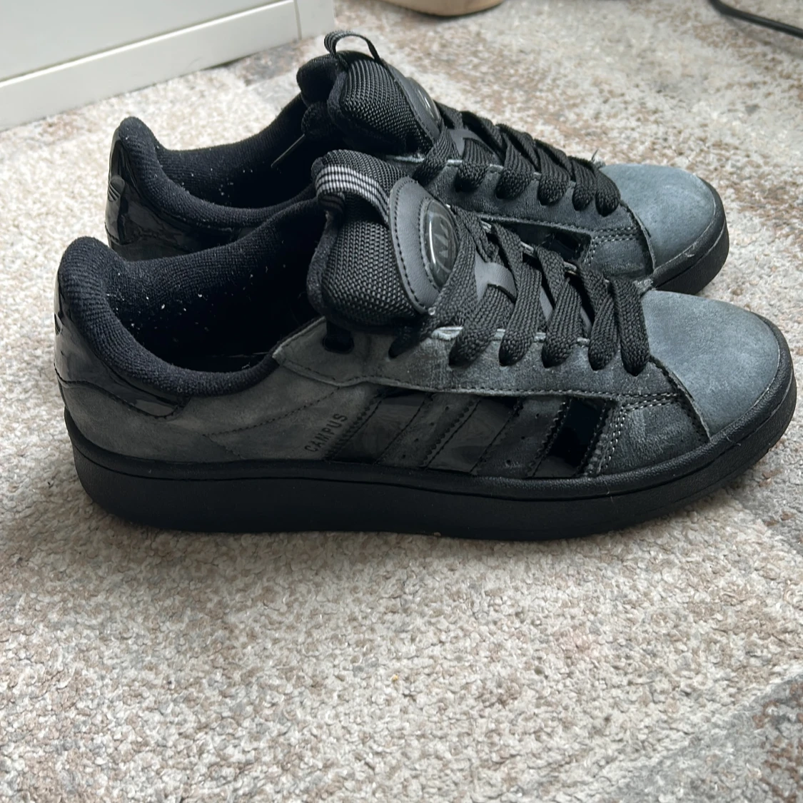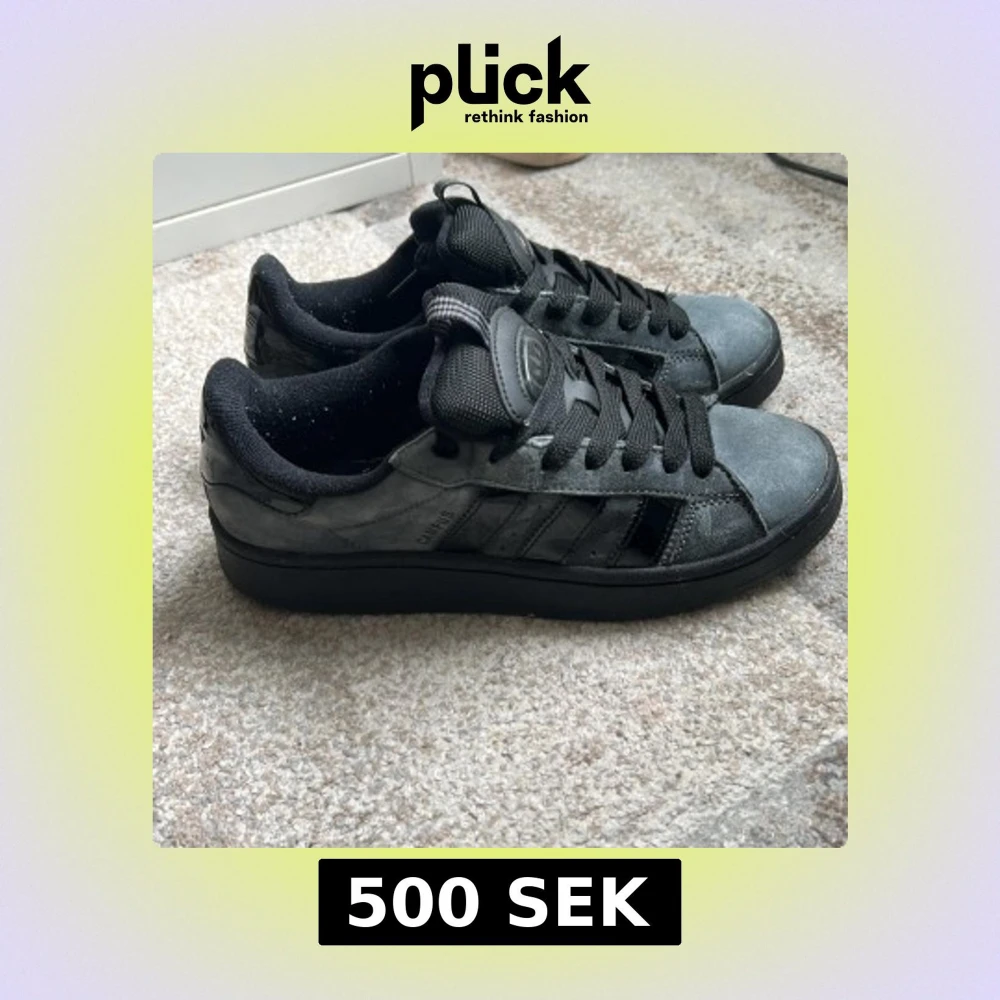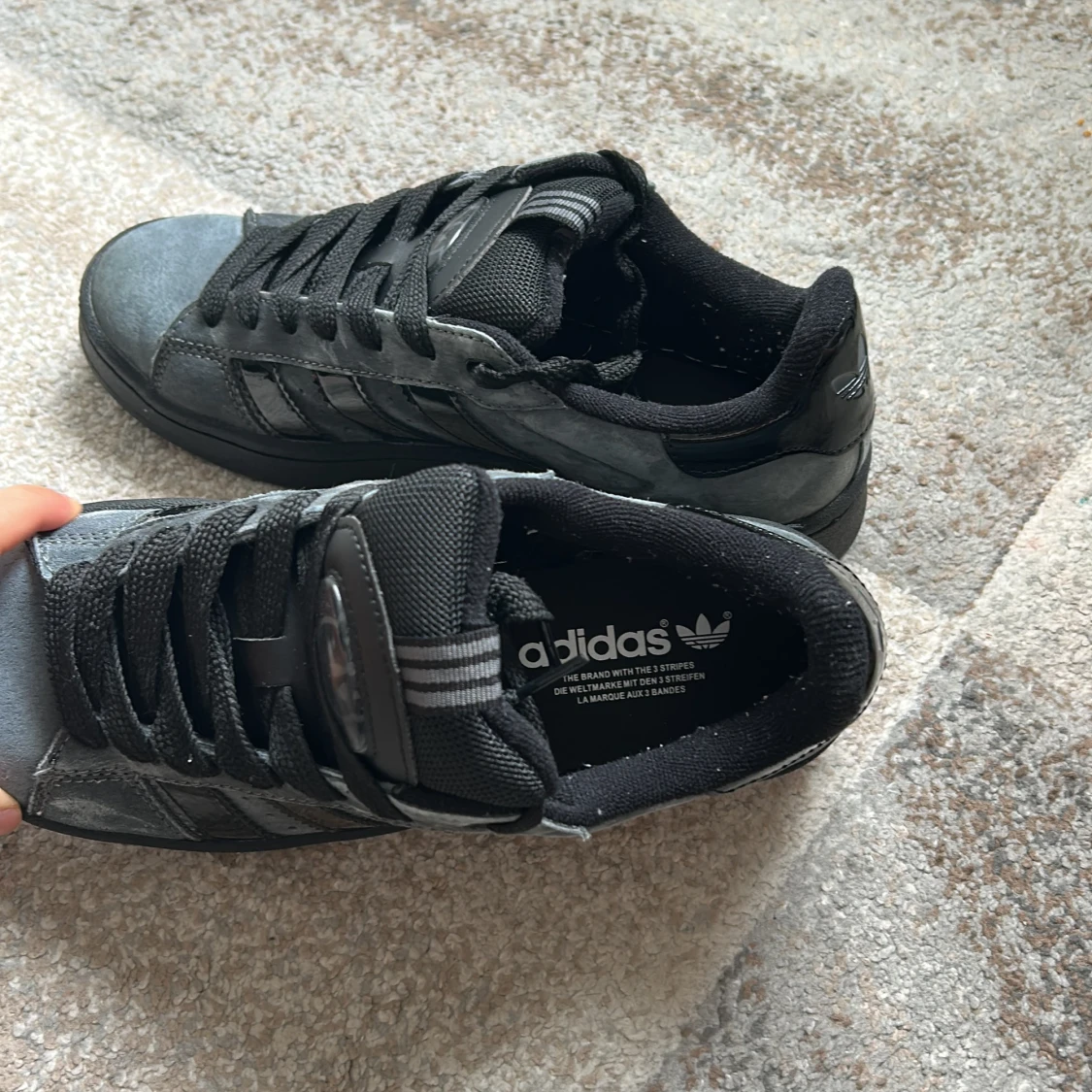 Säljer ett par Adidas Campus sneakers i mörkgrå och svart mocka med klassiska tre ränder på sidan. Skorna har rund tå, platt sula och svart snörning. Adidas-logga på hälen och tungan. Perfekt för dig som gillar stilrena och tidlösa sneakers.