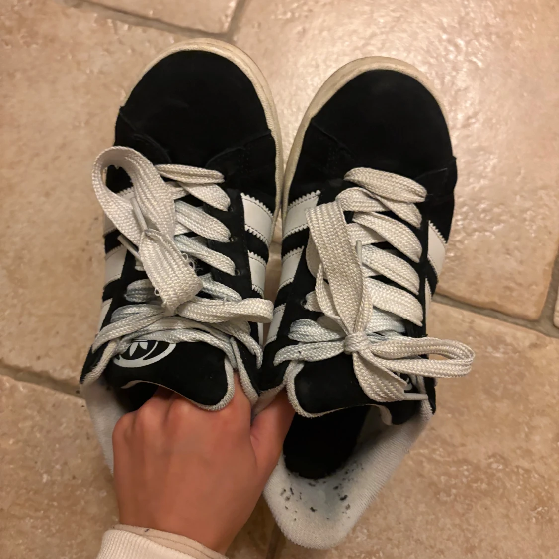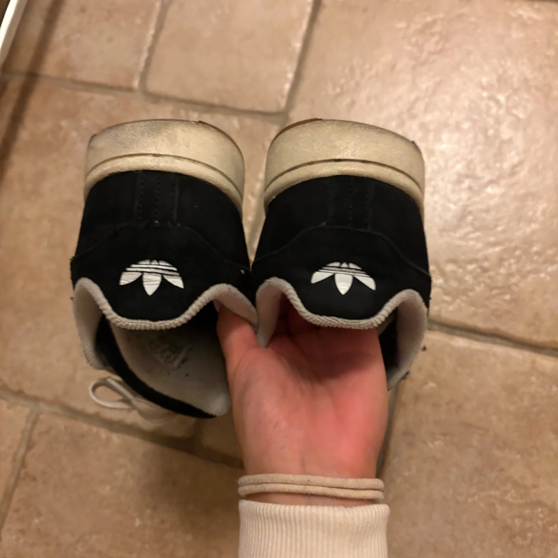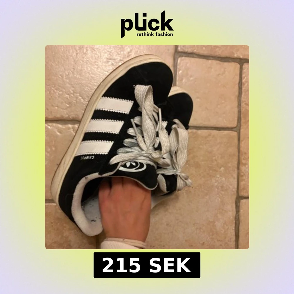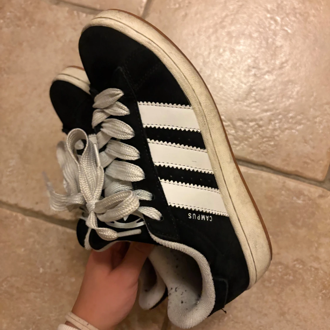 Svarta Adidas Campus sneakers med klassiska vita ränder och vit sula. Skorna har snörning och är gjorda i mocka med detaljer i syntet. Perfekta för dig som gillar en clean och tidlös streetstil.
