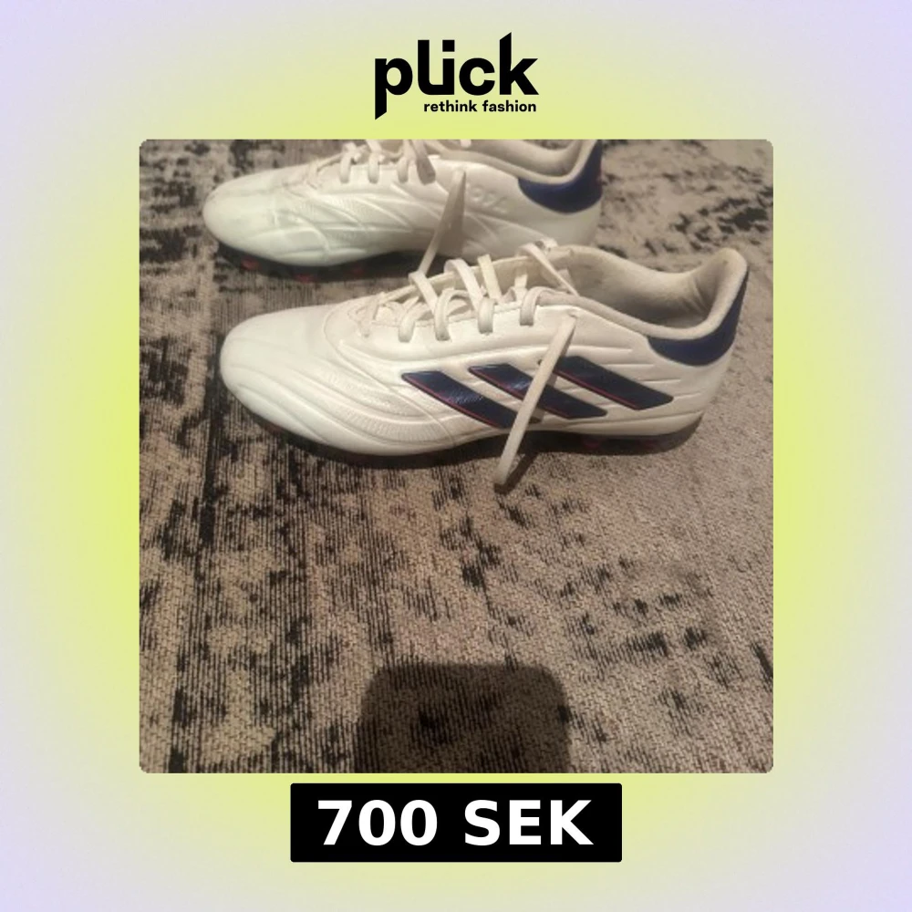 Säljer ett par Adidas fotbollsskor i vitt med blå detaljer och röda dobbar. Skorna har klassiska tre ränder på sidan, snörning och en snygg sportig design. Yttermaterialet är syntet och sulan är blå med röda dobbar för bra grepp på planen.