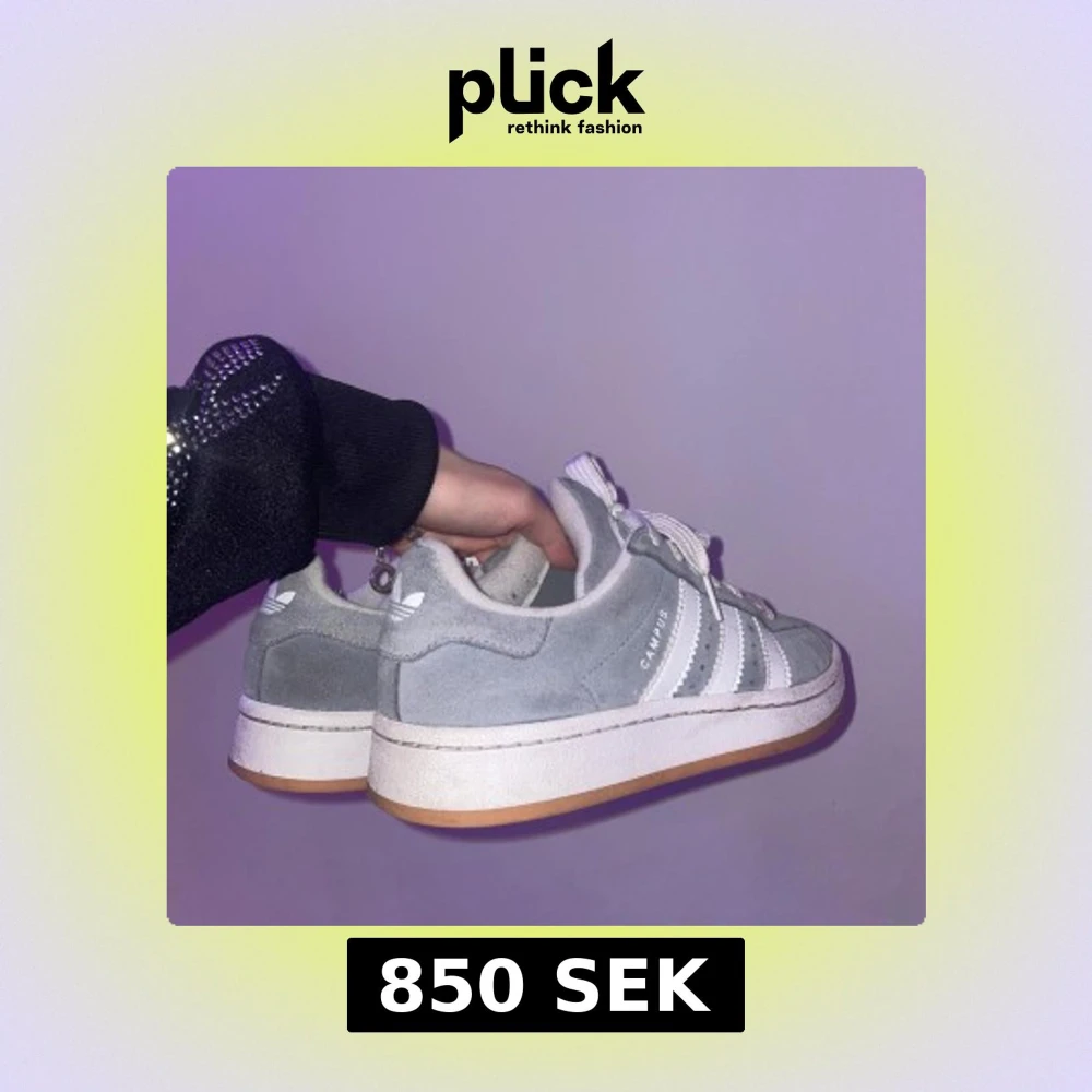 Snygga grå Adidas Campus sneakers med klassiska vita ränder och snörning. Skorna har en stilren design med en bekväm gummisula. Perfekta för en avslappnad stil.🤍