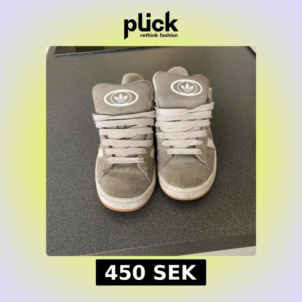 Säljer ett par gråa Adidas sneakers med klassisk vit logga på plösen och baksidan. Skorna har snörning och är tillverkade i mocka med vit sula. Perfekta för en avslappnad och sportig stil. Kommer med 2 extra snören gråa
