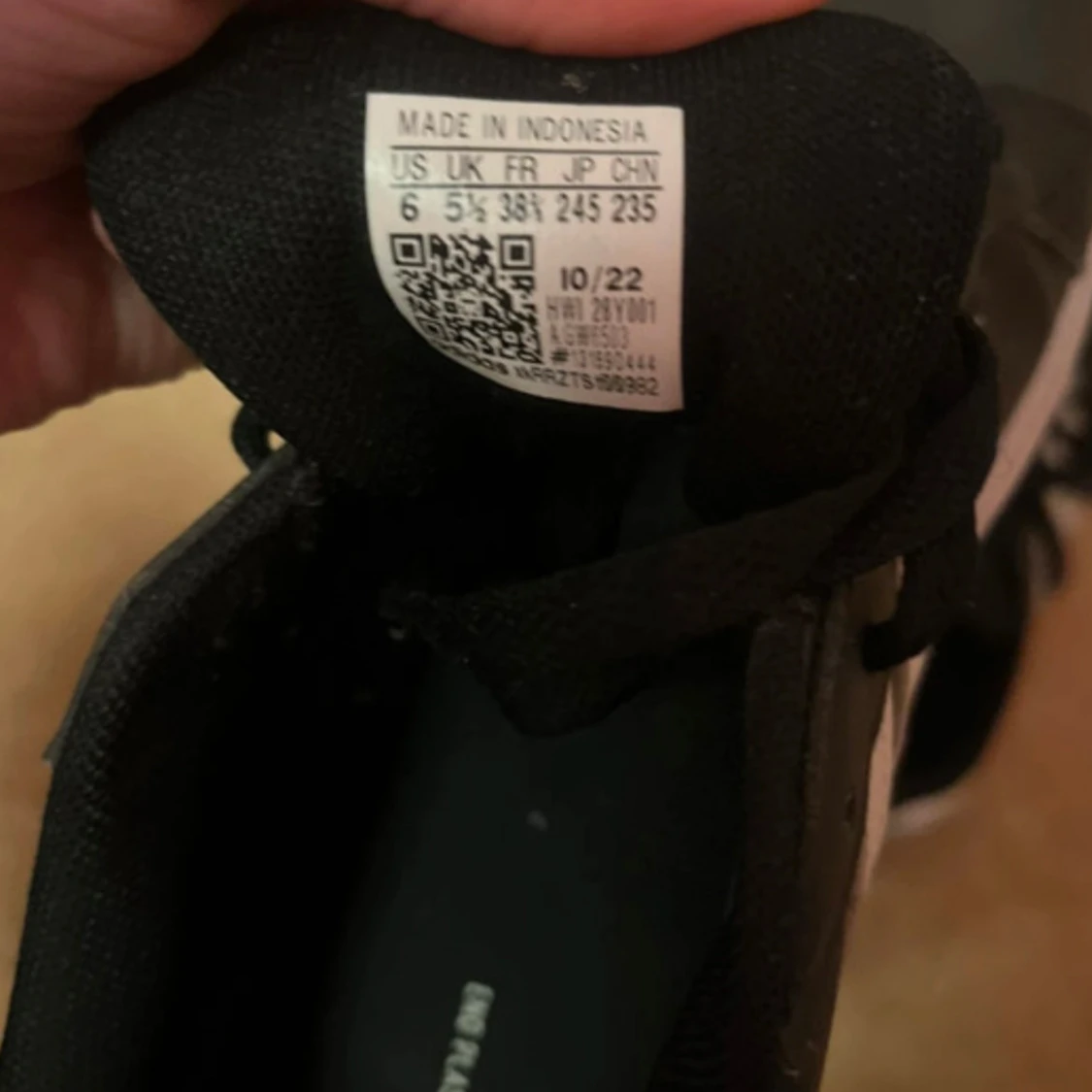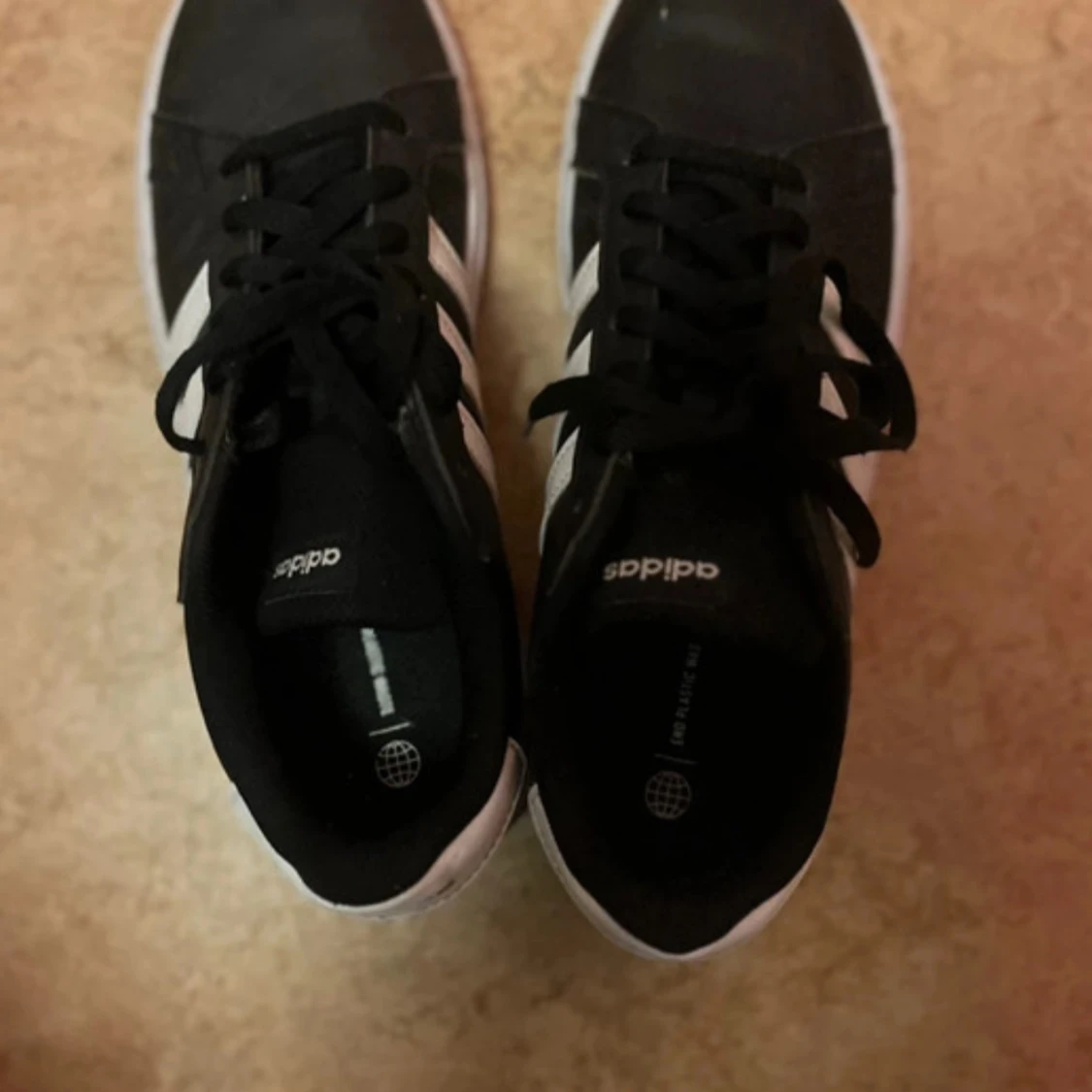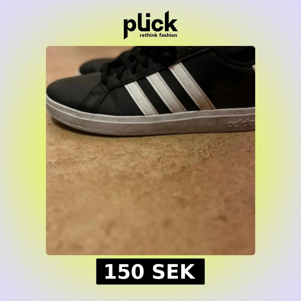 Säljer ett par klassiska svarta Adidas sneakers med de ikoniska tre vita ränderna på sidan. Skorna har en rund tå och snörning framtill. Perfekta för en avslappnad stil.