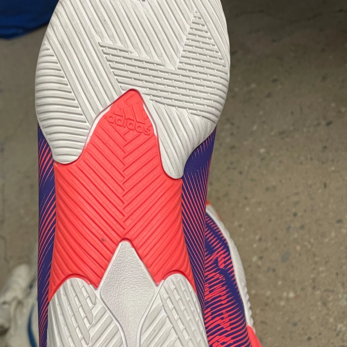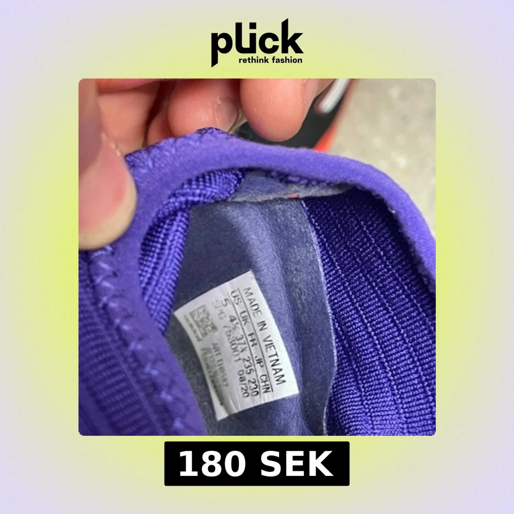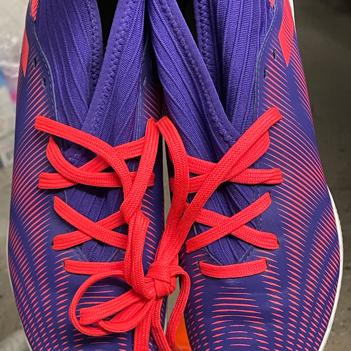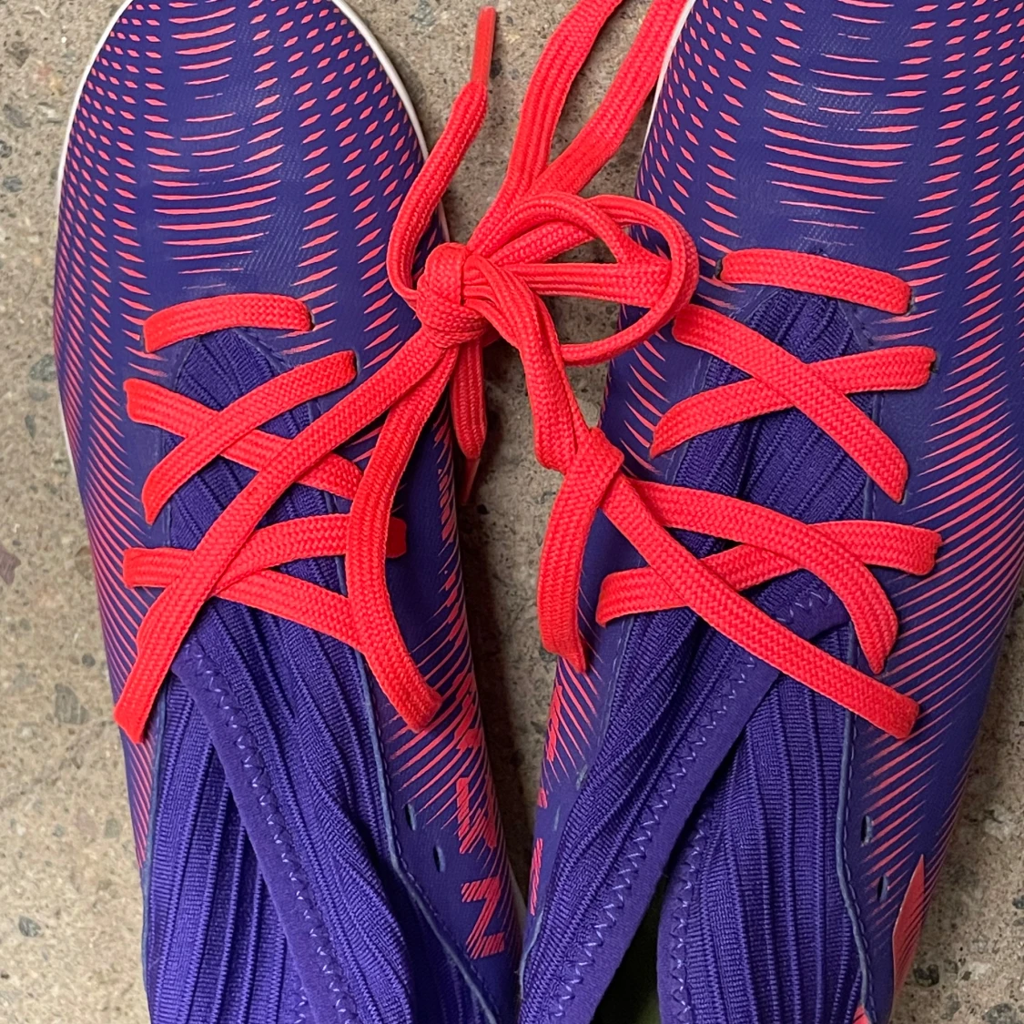Säljer ett par Adidas fotbollsskor i lila med neonrosa snörning och mönster. Skorna har en syntetisk ovandel och vit/röd sula med Adidas-logga undertill. Perfekta för dig som vill sticka ut på planen!