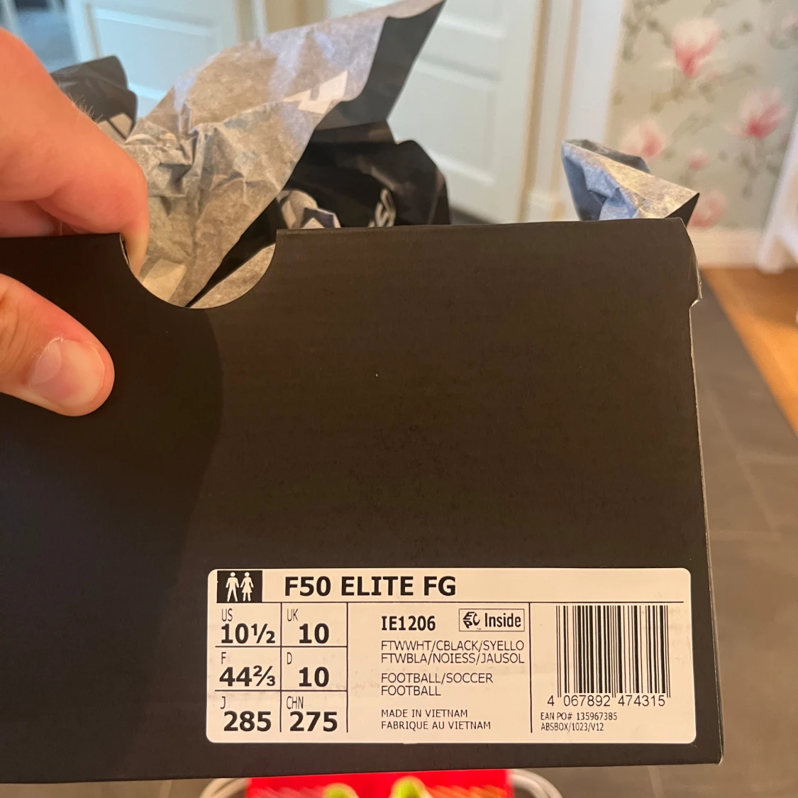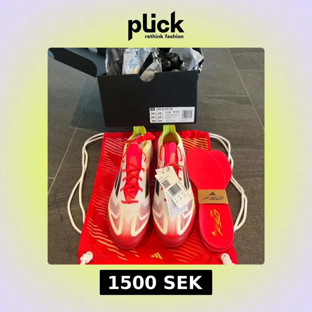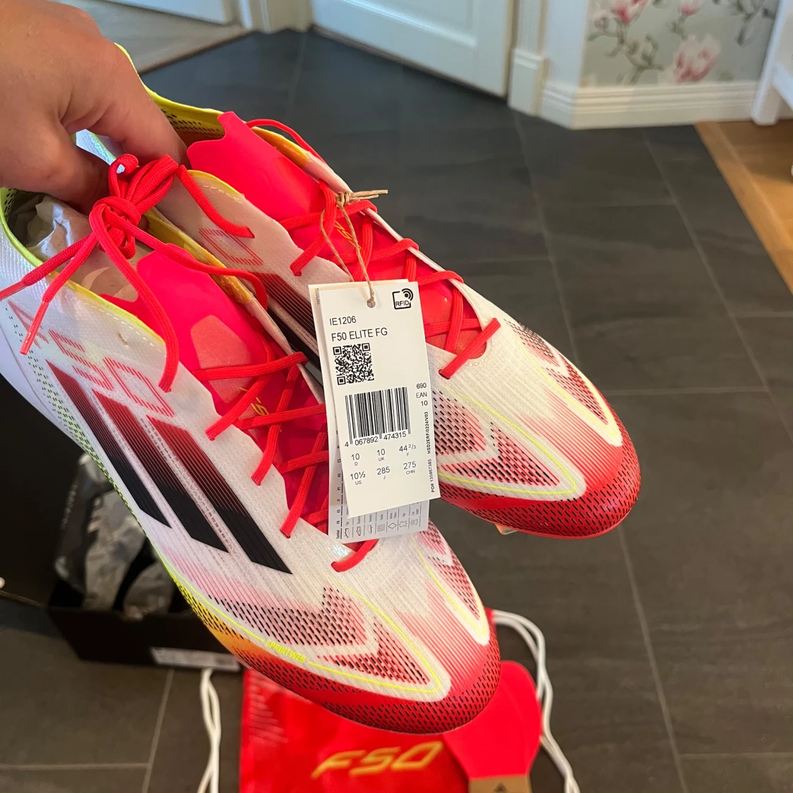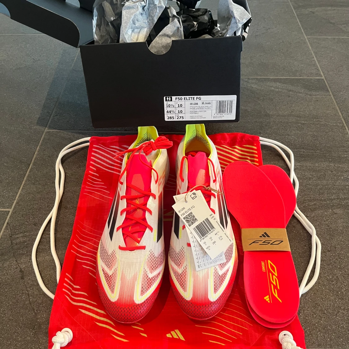 Säljer ett par Adidas F50 Elite FG fotbollsskor i vitt, rött och svart med gula detaljer. Skorna har snörning, låg profil och är tillverkade i lätt syntetmaterial för maxad speed på planen. Snygg design med svarta ränder och röda sulor. Perfekta för dig som vill sticka ut på matchen.