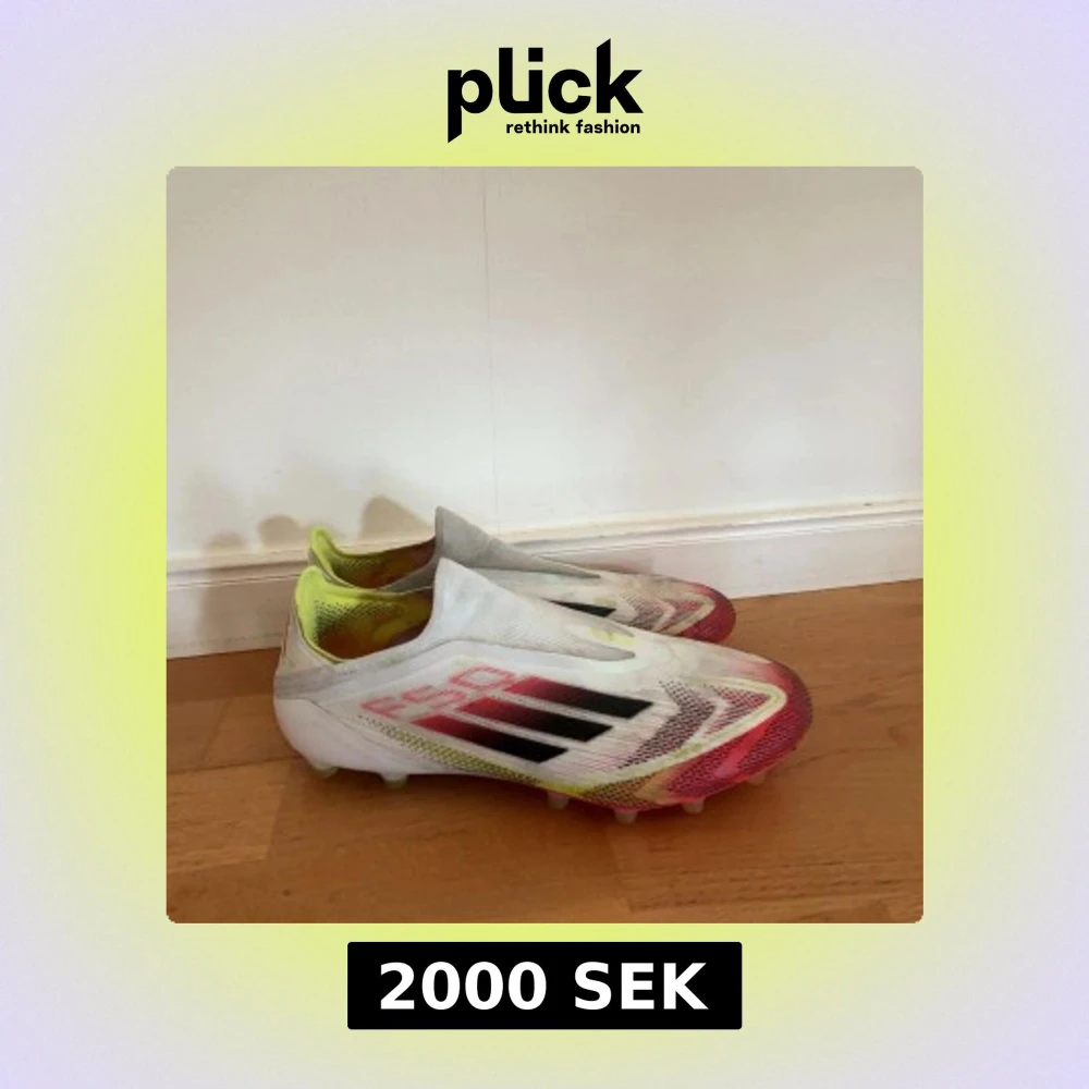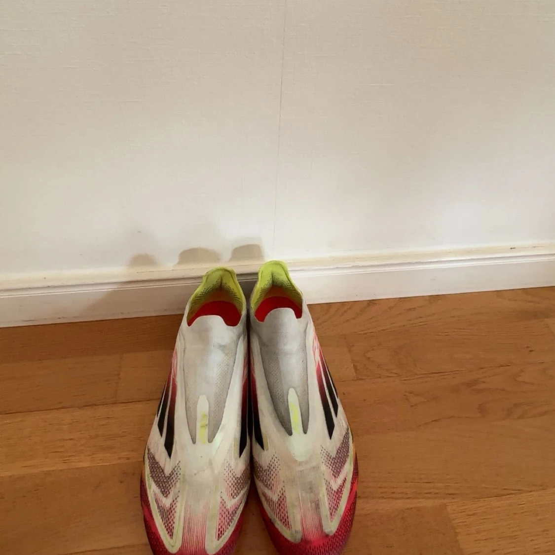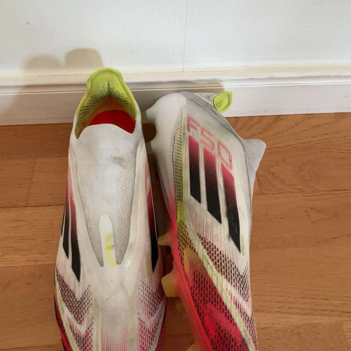 Säljer ett par Adidas F50 fotbollsskor i vitt med röda och svarta detaljer samt gula inslag vid hälen. Skorna har en strömlinjeformad design utan snörning och ovandel i syntetmaterial för lätt känsla på planen. Perfekta för dig som vill sticka ut på fotbollsplanen. Lite smutsiga men annars inga fel alls!