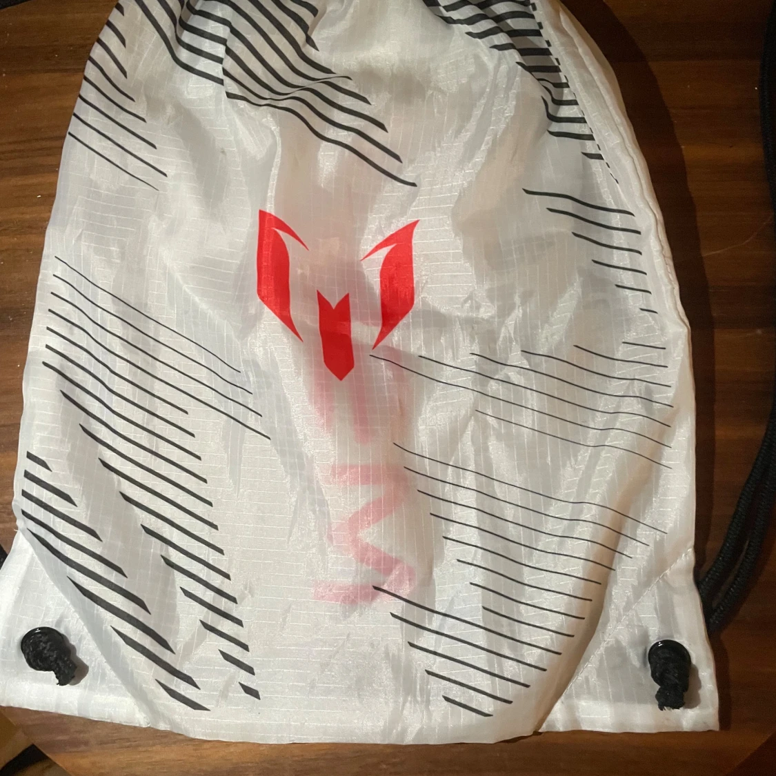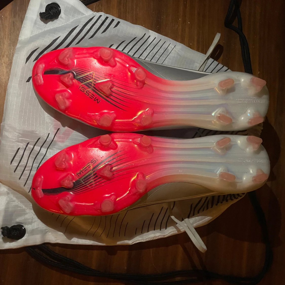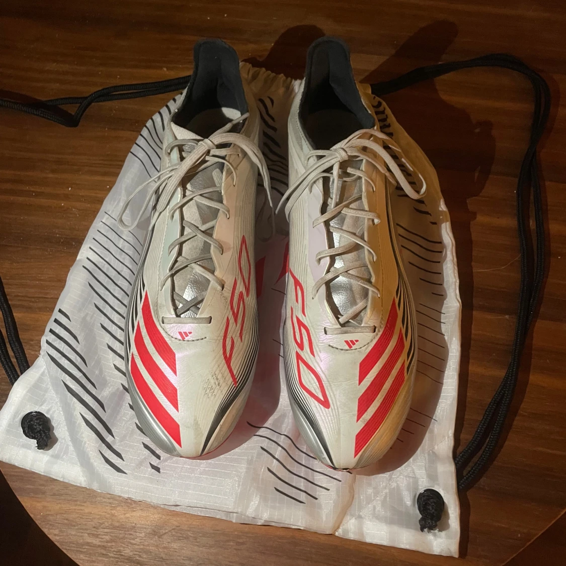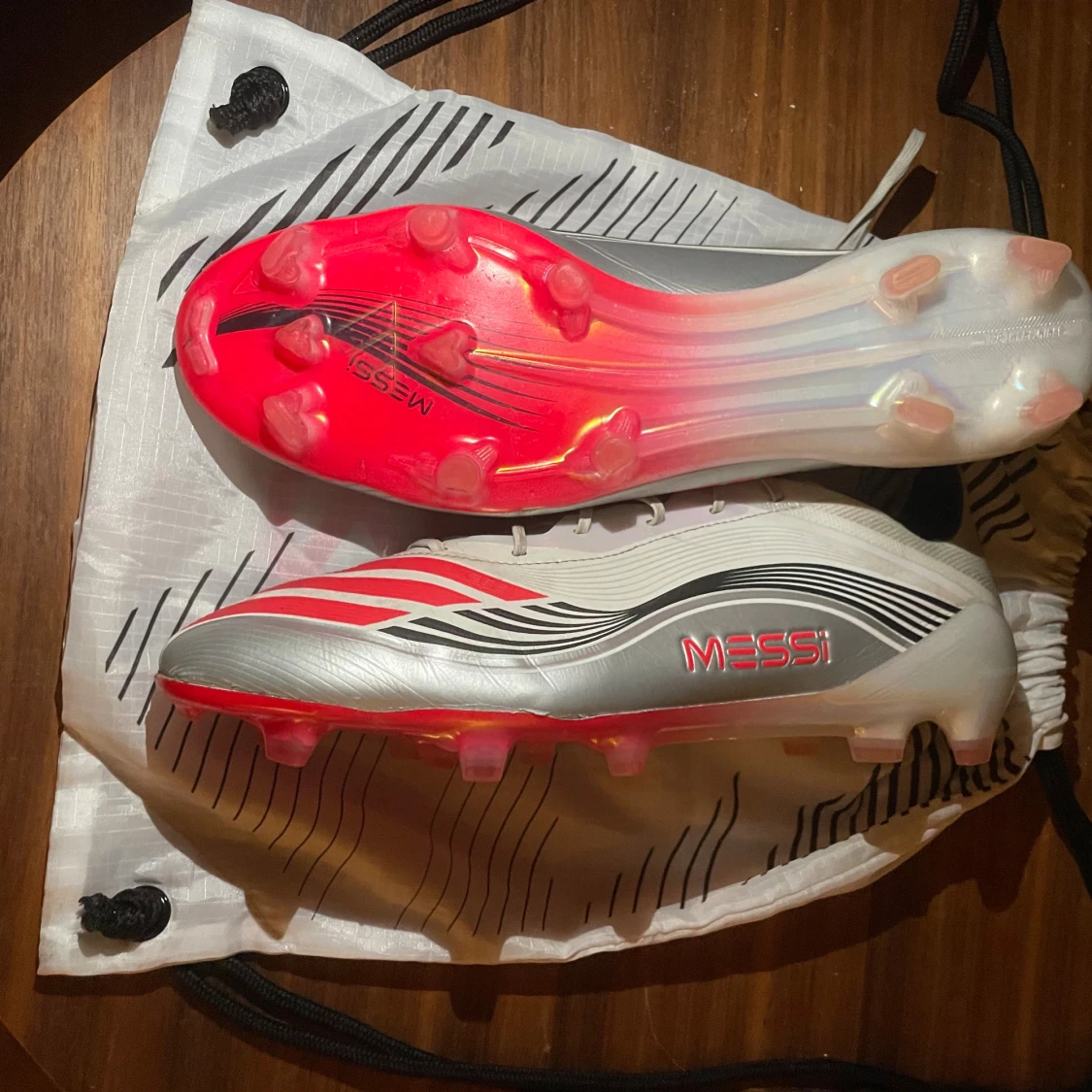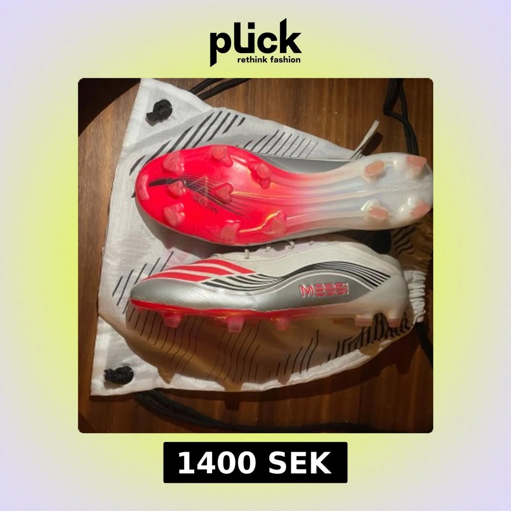 Säljer ett par Adidas F50 Messi fotbollsskor i vitt, silver och rött med coola svarta detaljer. Skorna har snörning, spetsig tå och platt sula med röda dobbar. Messi-logga på sidan och undersidan. Perfekta för dig som vill sticka ut på planen!