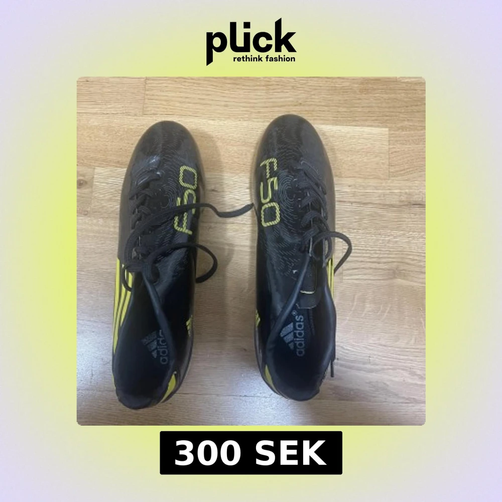 Svarta Adidas F50 fotbollsskor med gula detaljer och dobbar. Snygg sportig design med snörning och mönstrad ovandel. Perfekta för dig som vill sticka ut på planen. Storlek 43 (EU), 8.5 (US).