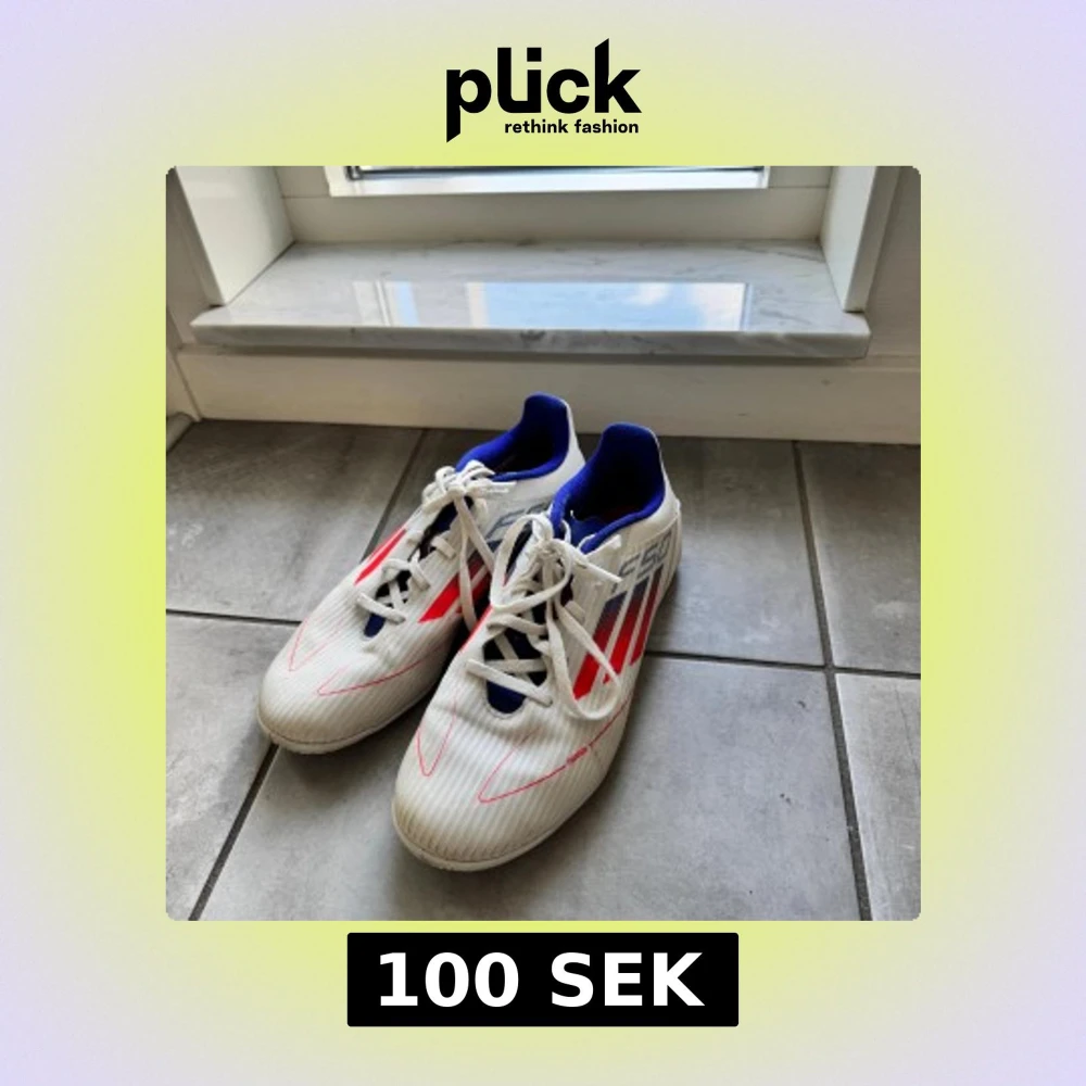 Säljer ett par Adidas F50 fotbollsskor i vitt med röda och blå detaljer. Skorna har snörning, blå insida och klassiska Adidas-ränder på sidan. Ovandelen är i syntetmaterial och sulan är mönstrad för bra grepp på planen.