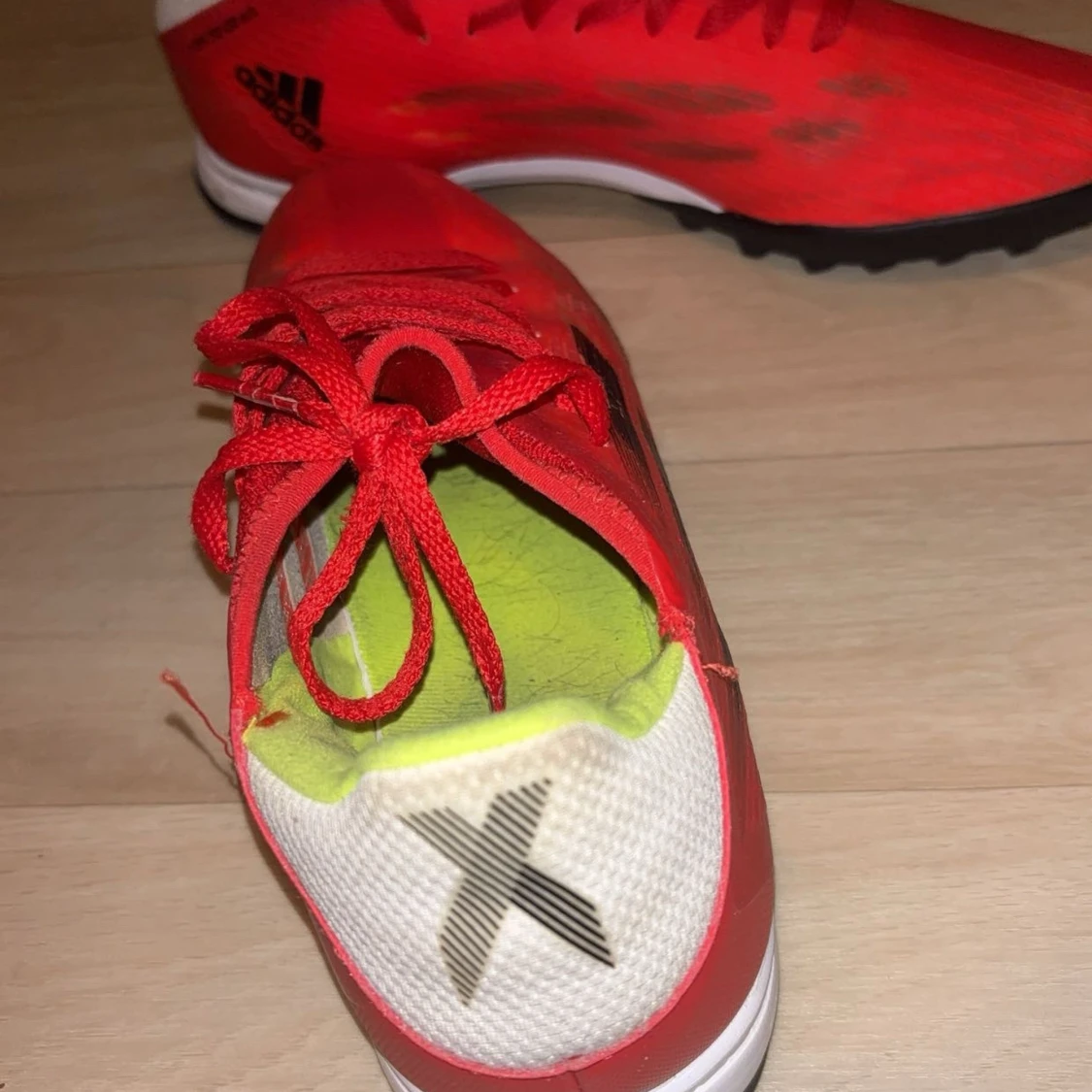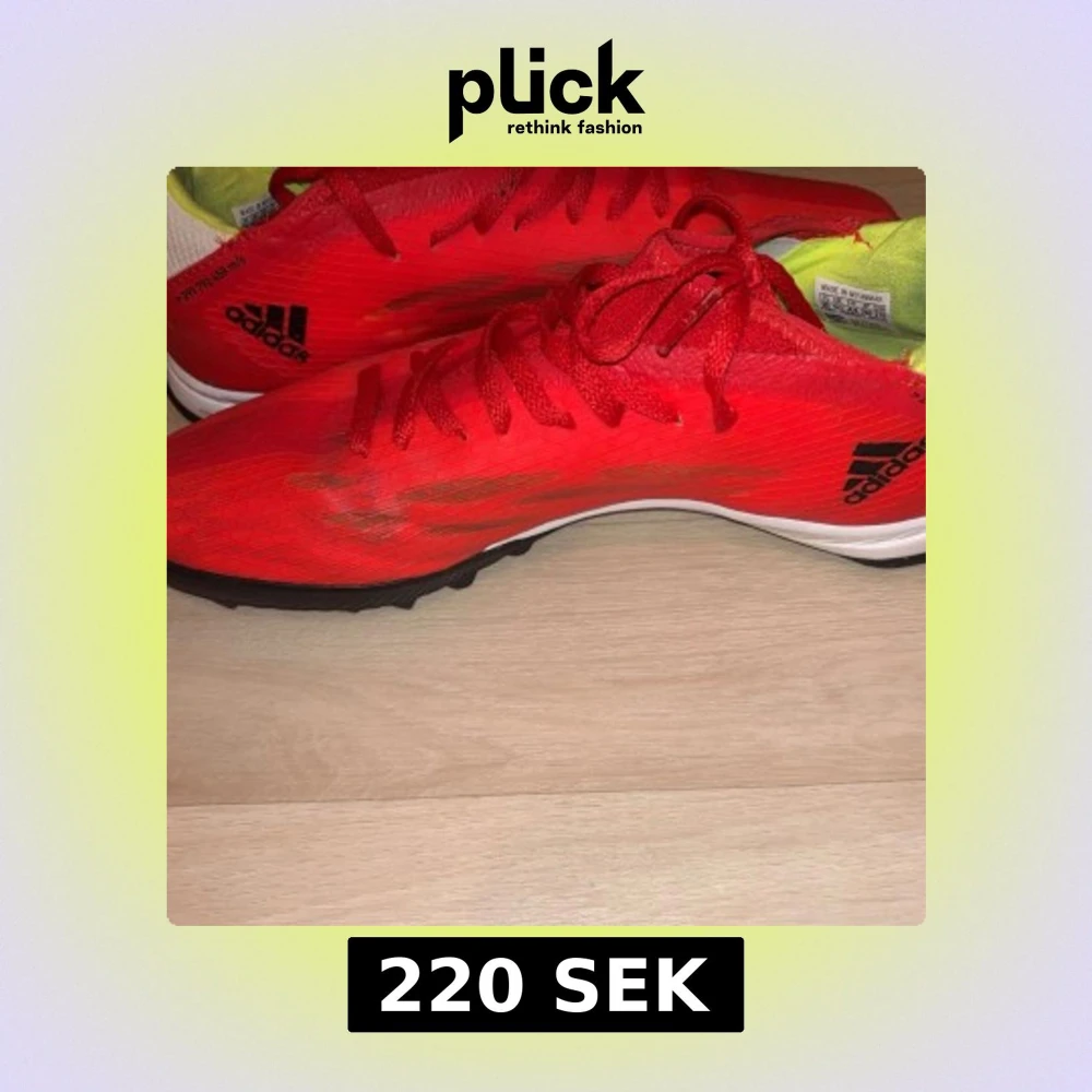 Säljer ett par begagnade Adidas-fotbollsskor i bra skick. Skorna är anpassade för spel på konstgräs/grus med små dubbar för bra grepp. • Storlek: 44 • Färg: Röd med svart och gult • Märke: Adidas Perfekta för träning eller matcher! Skorna är bekväma och fortfarande fullt användbara. Säljes på grund av att jag inte använder dem längre.