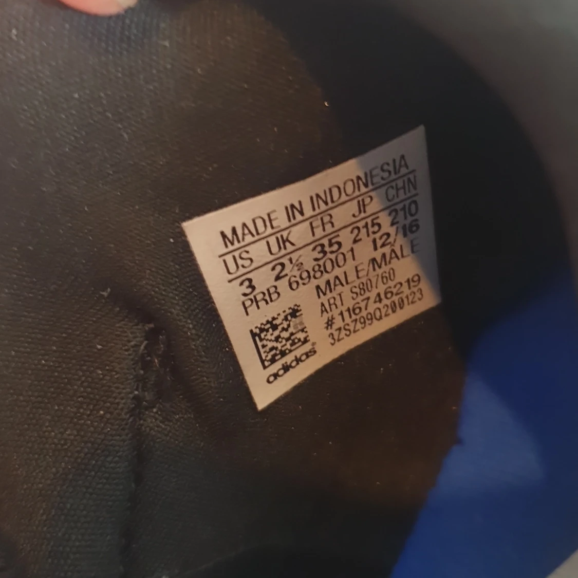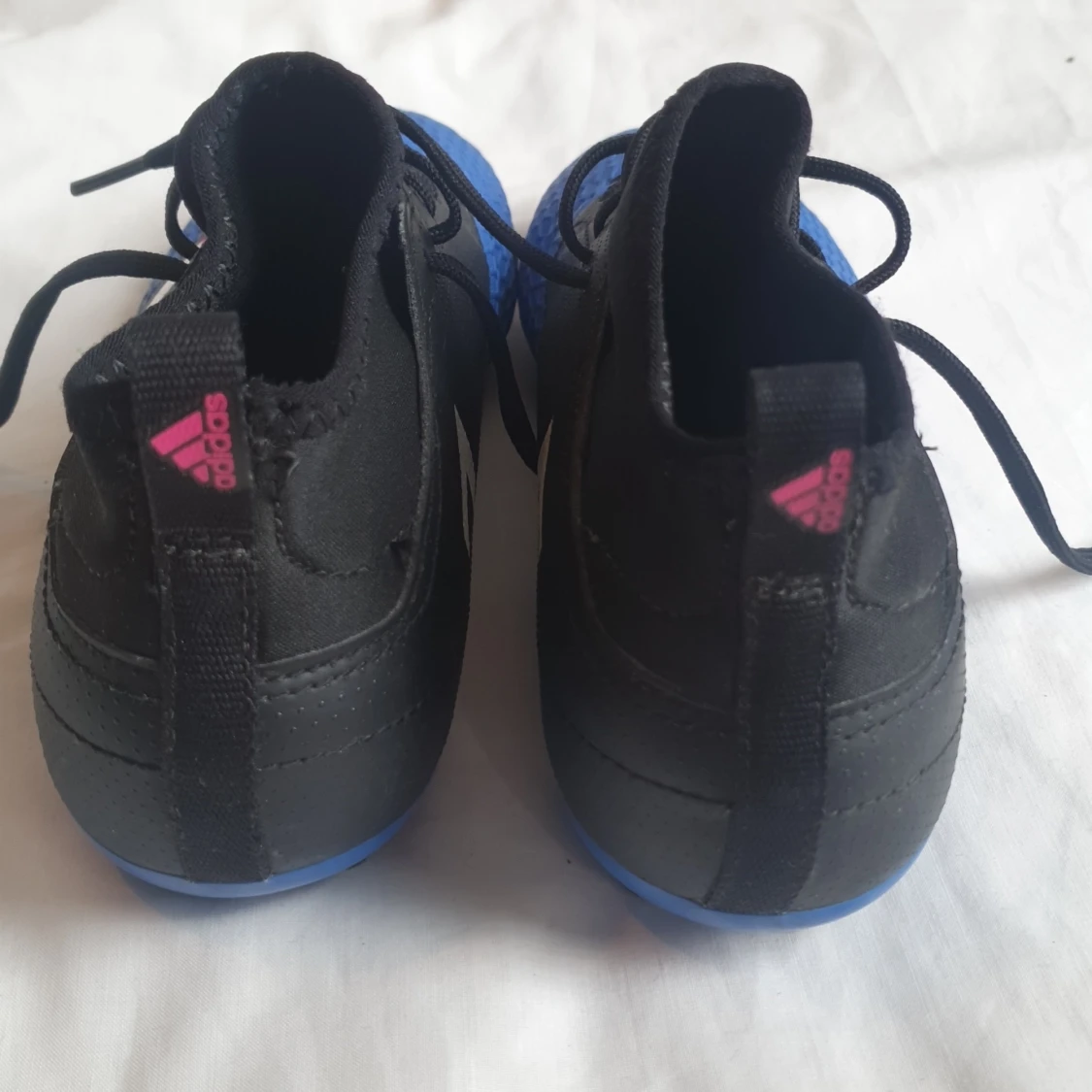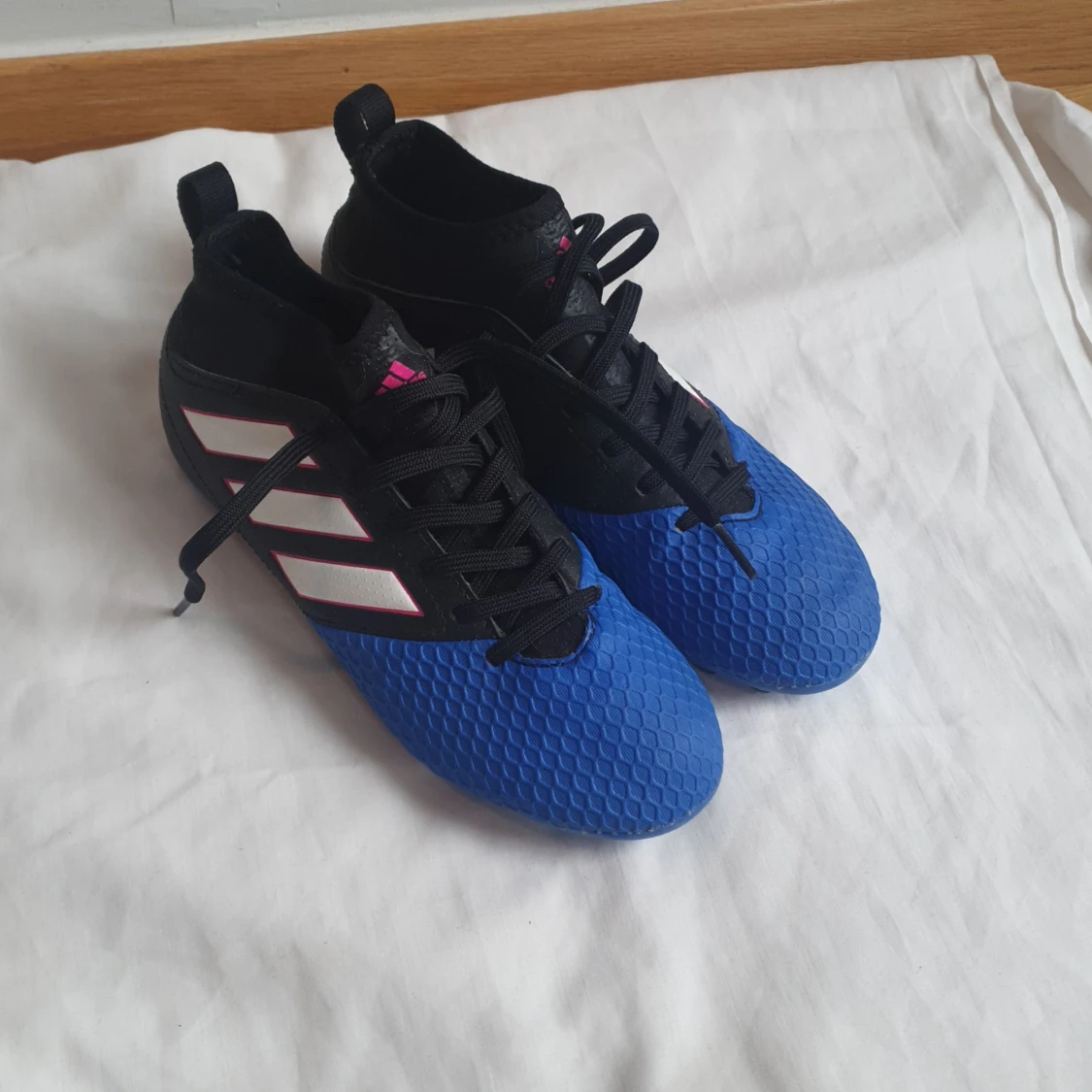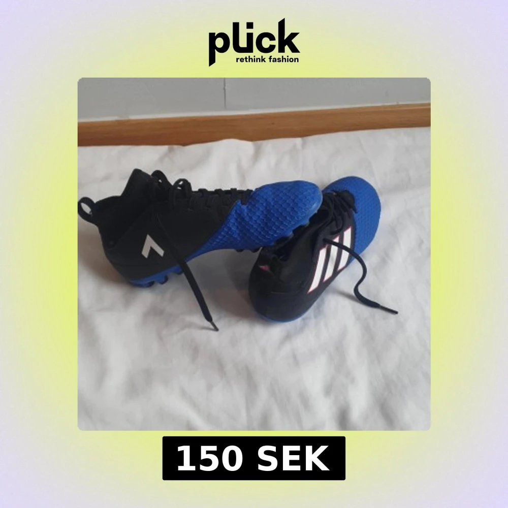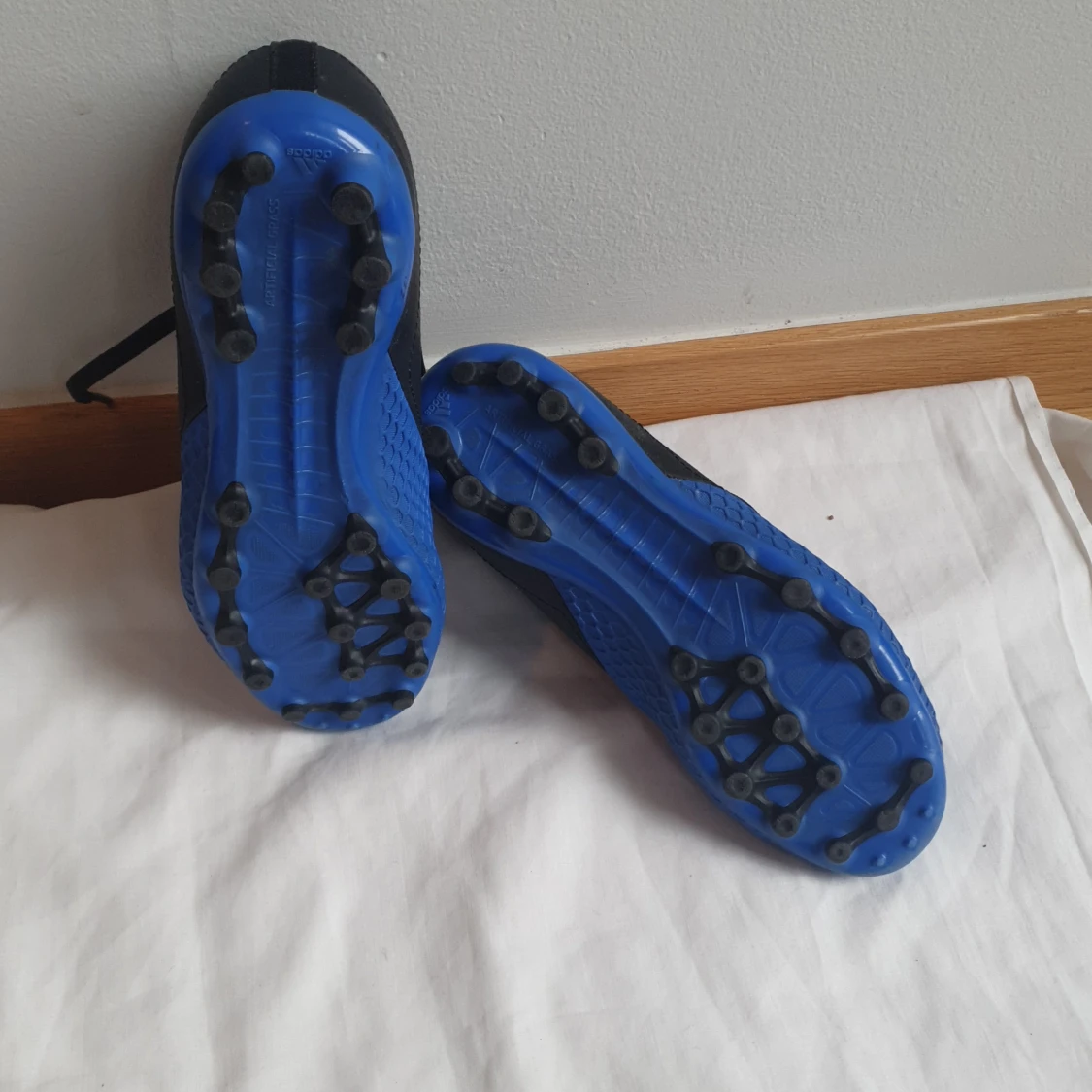 Säljer ett par Adidas fotbollsskor i svart och blått med vita ränder på sidan. Skorna har snörning och mönstrad ovandel för extra grepp. Perfekta för dig som vill ha stilrena och sportiga skor på planen.