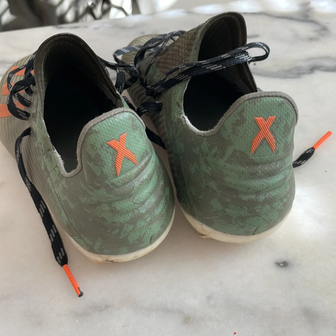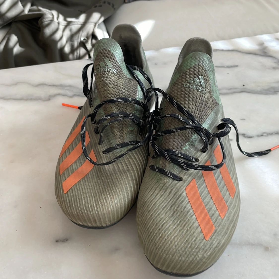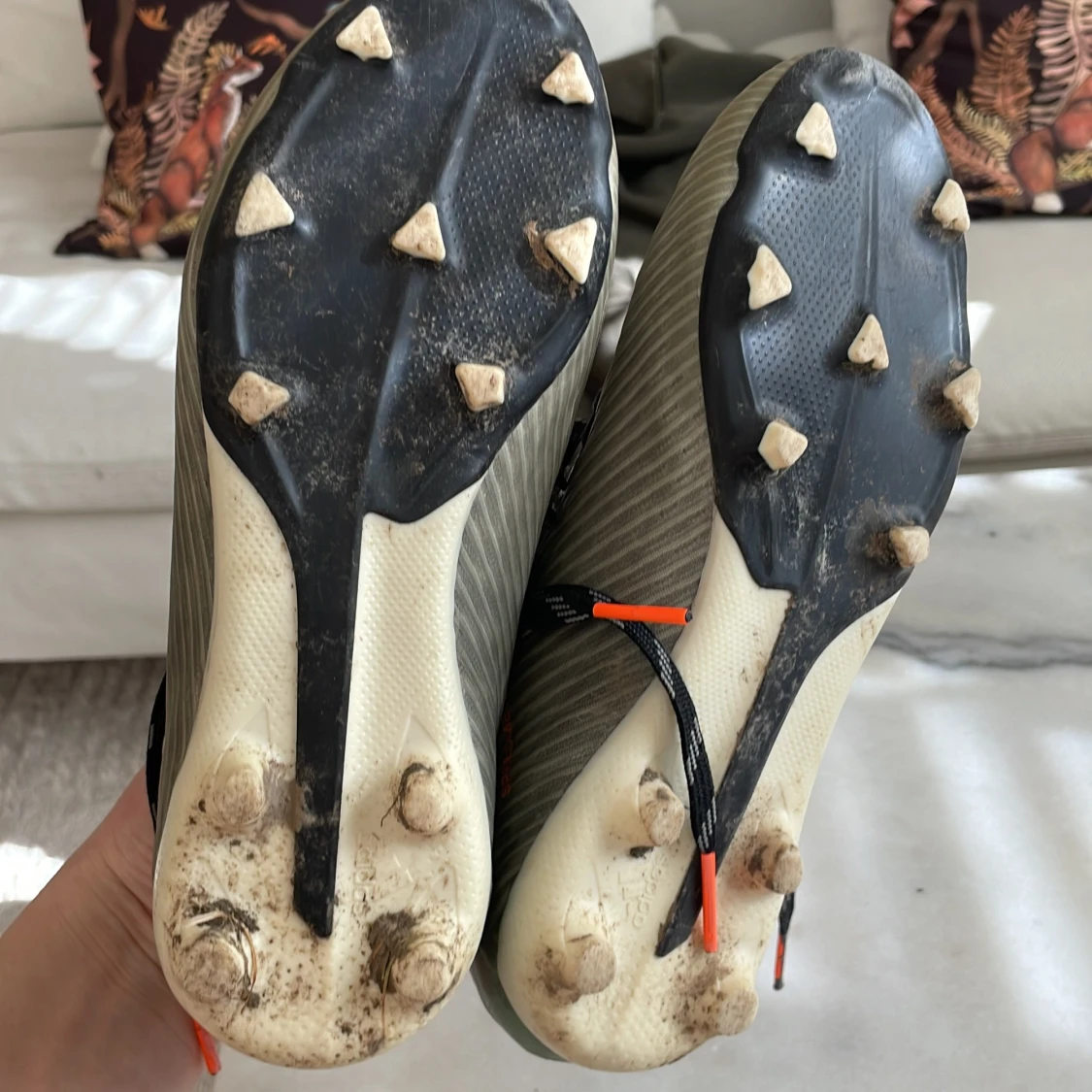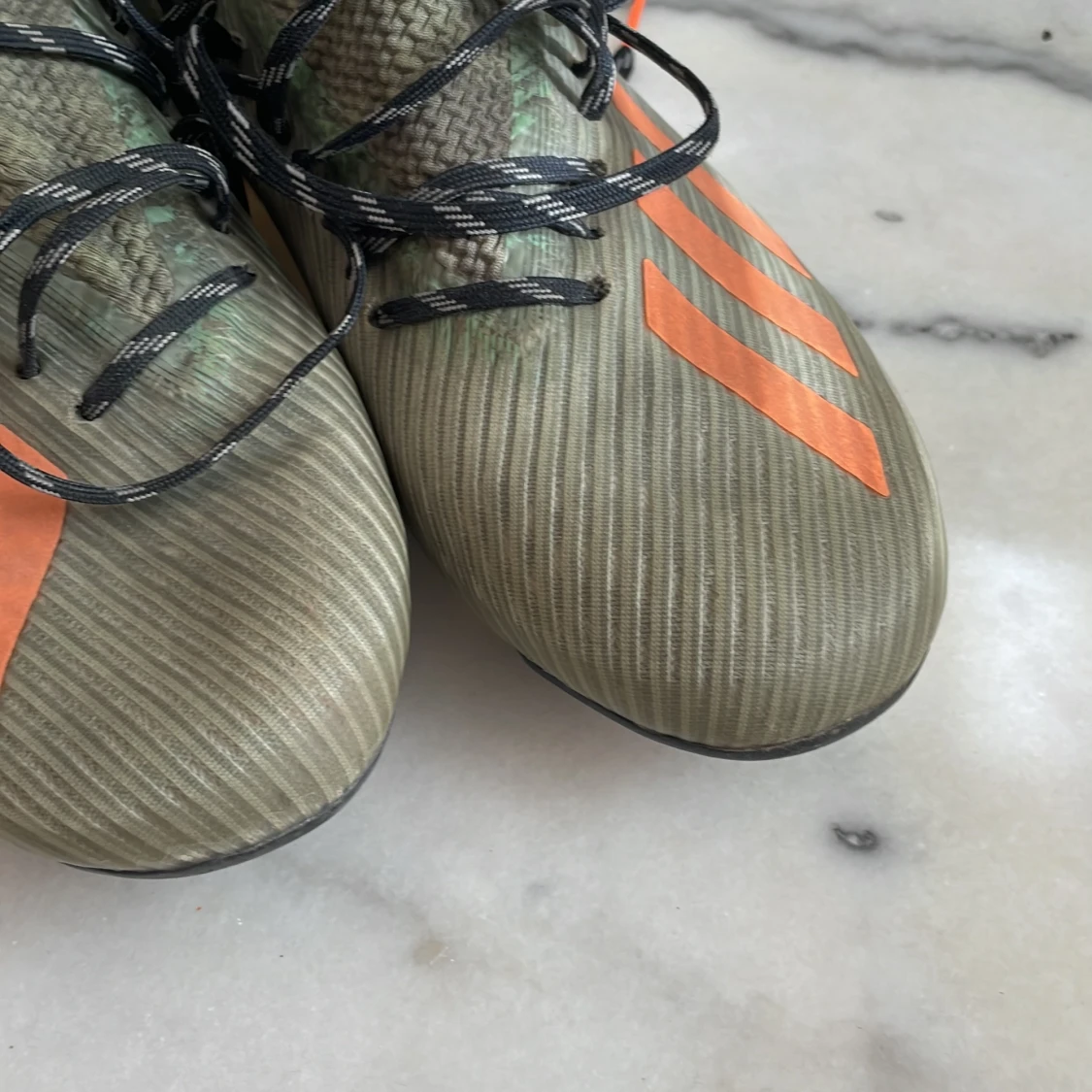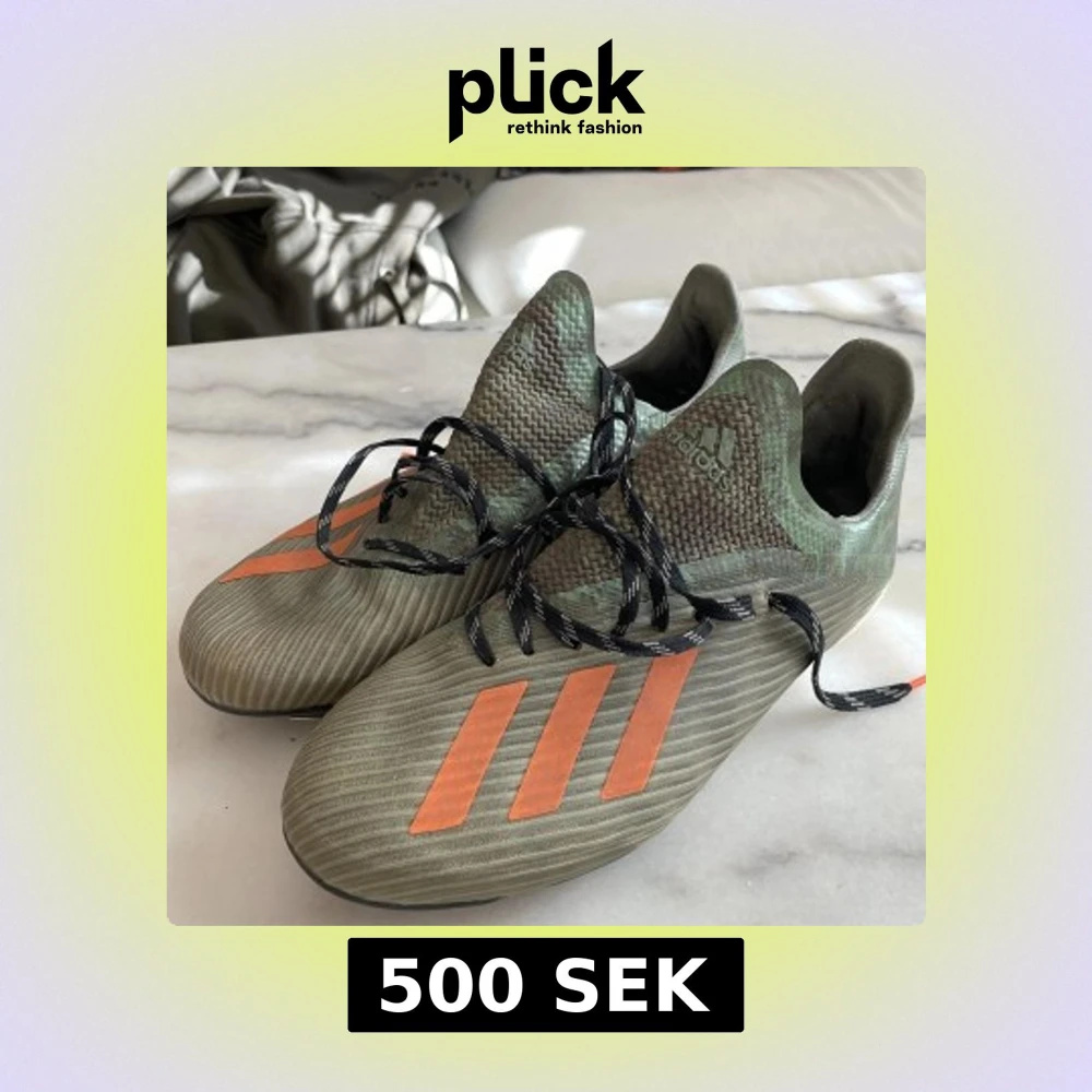 Snygga Adidas fotbollsskor i en cool grön färg med orange detaljer. Skorna har snörning och en rund tå, perfekt för fotbollsplanen. De har en modern design med de klassiska tre ränderna på sidan. Lite jord på dobbarna men de går att tvätta bort lätt