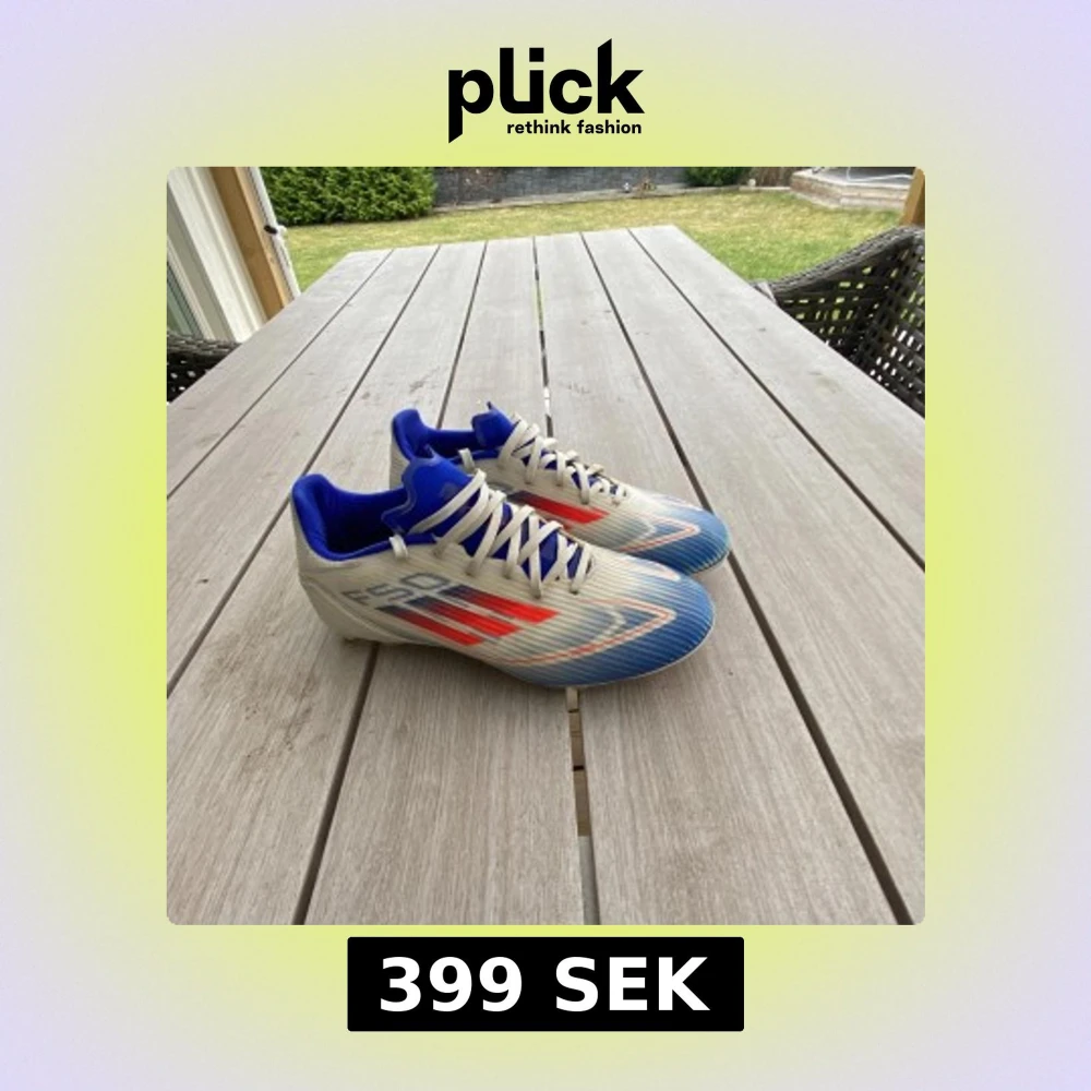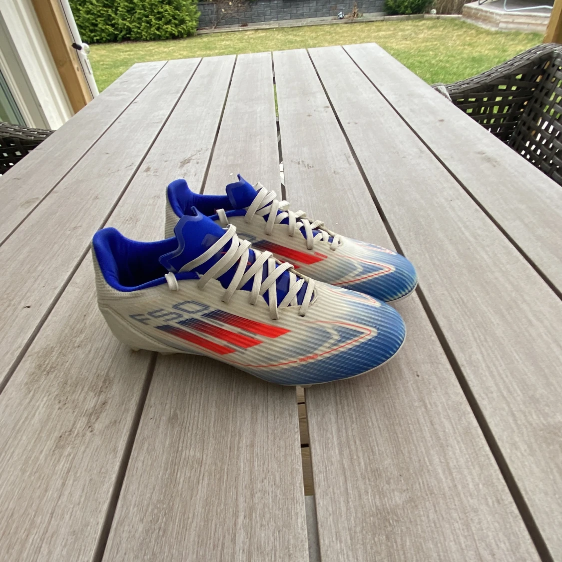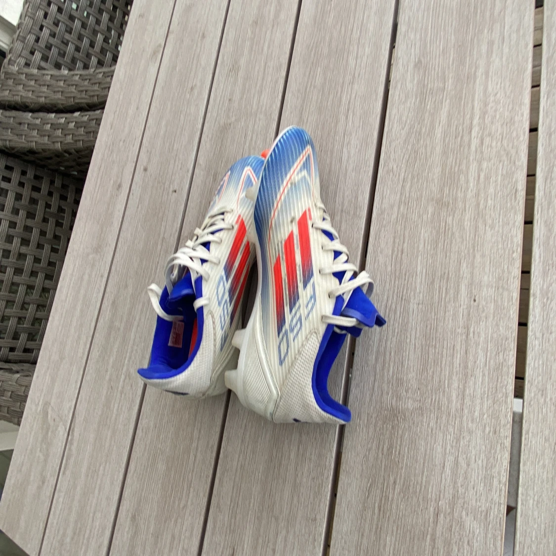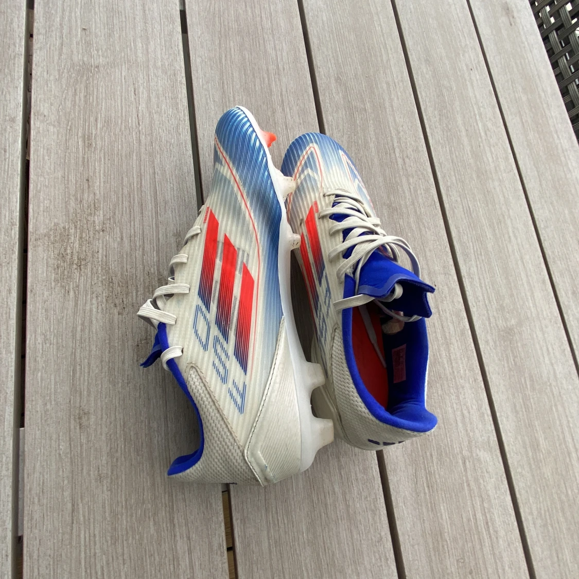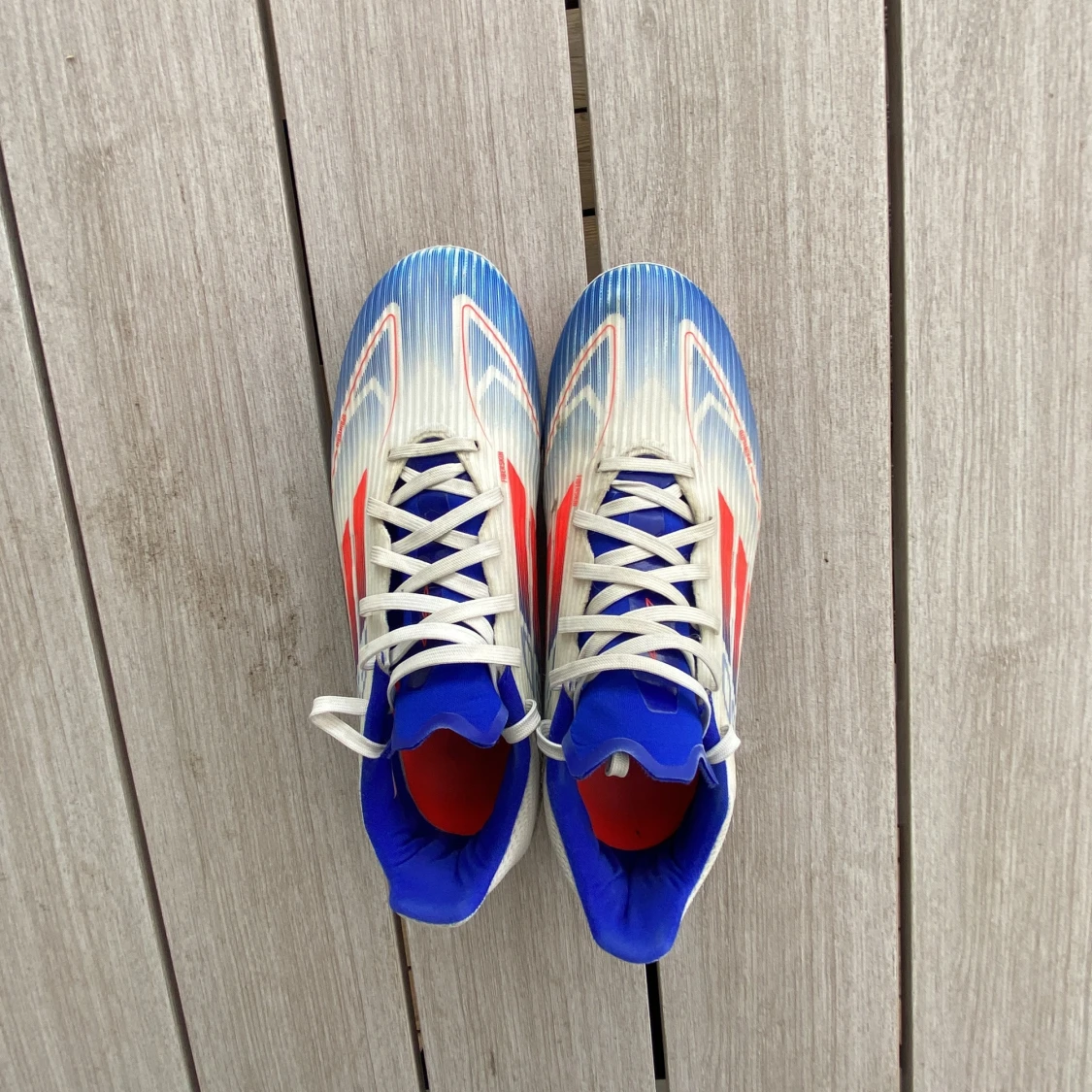 Snygga Adidas fotbollsskor i vitt med blå och röda detaljer. Skorna har snörning och en sportig design som passar perfekt för fotbollsplanen.