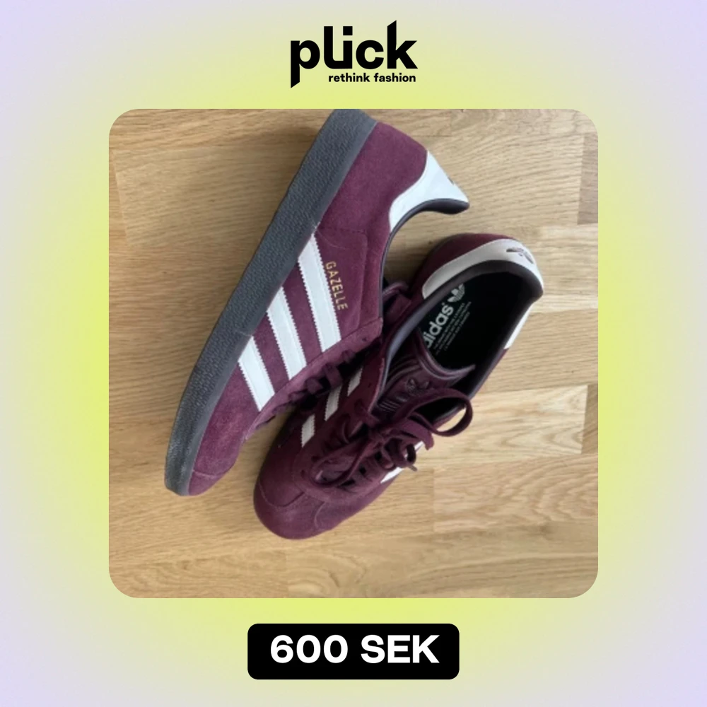 Ett par Bordeaux färgade Adidas Gazelle sneakers med vita detaljer och svarta sulor. Skorna har de klassiska tre ränderna på sidorna och är i mocka material.