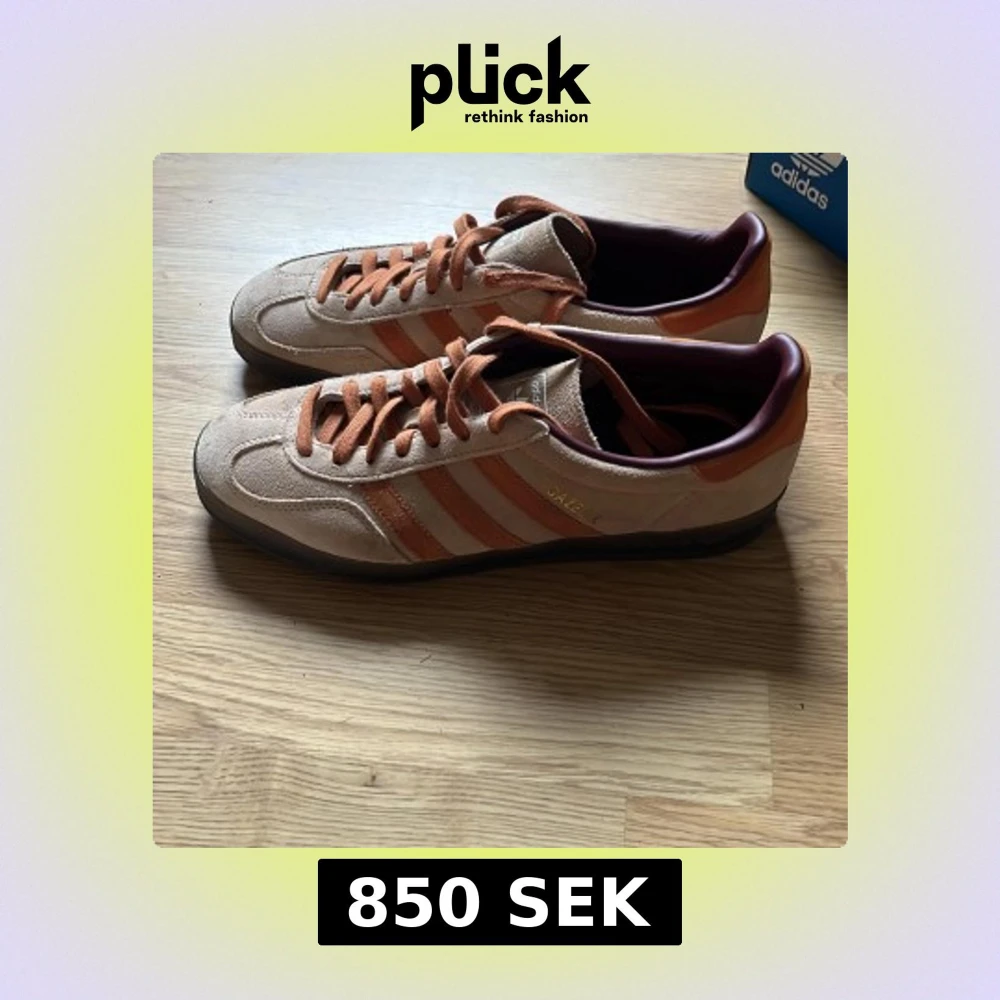 Säljer ett par Adidas Gazelle sneakers i beige mocka med orangea ränder och snörning. Skorna har en klassisk låg profil, rund tå och gummisula med mönster. Insidan är fodrad i mörkare vinröd ton. Perfekt för dig som gillar retrostil och snygga färgkombinationer. Några fläckar på något ställe men annars helt felfria