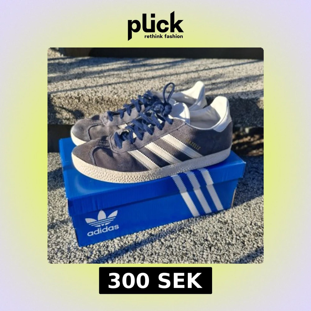 Säljer ett par Adidas Gazelle sneakers i mörkblå mocka med vita detaljer och klassiska tre ränder på sidan. Skorna har rund tå, platt sula och snörning. Insidan är vit och de har en stilren retrovibe. Perfekt för dig som gillar ikoniska streetwear-skor. Om du har frågor är det bara att skriva till mig.