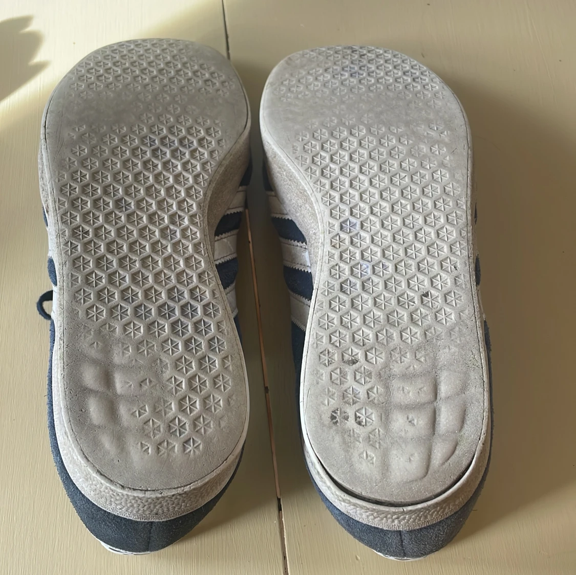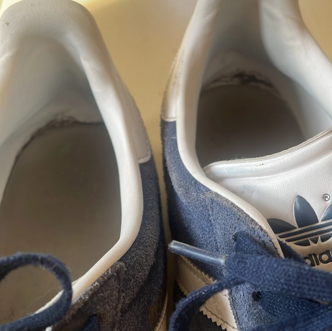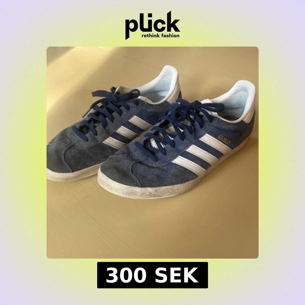 Säljer ett par klassiska Adidas Gazelle sneakers i marinblå mocka med vita detaljer och snörning. Skorna har de ikoniska tre ränderna på sidan och guldtexten 'GAZELLE'. Perfekta för dig som gillar retrostil och streetwear.