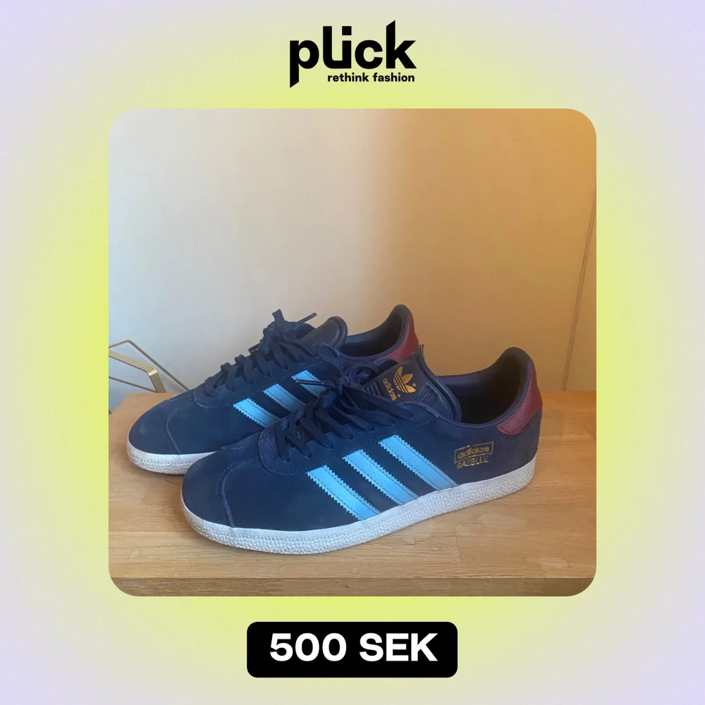 Säljer ett par snygga knappt andvända Adidas Gazelle sneakers i blå mocka med röda detaljer och ljusblå ränder. Skorna har en klassisk design med snörning och vit sula. Perfekta för både vardag och fest! 🕺
