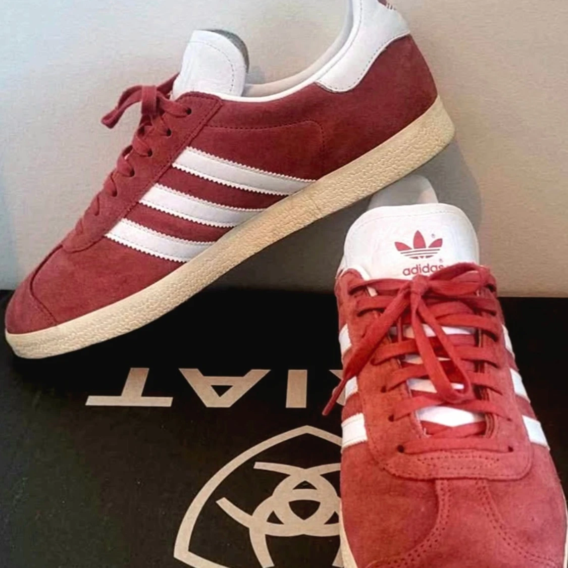 Säljer ett par snygga Adidas Gazelle sneakers i röd mocka med vita detaljer och klassiska tre ränder på sidan. Skorna har platt sula, rund tå och snörning. Perfekta för dig som vill ha en retro vibe och sticka ut med färg.