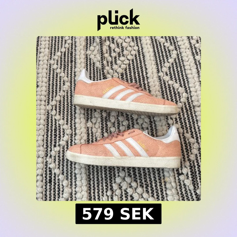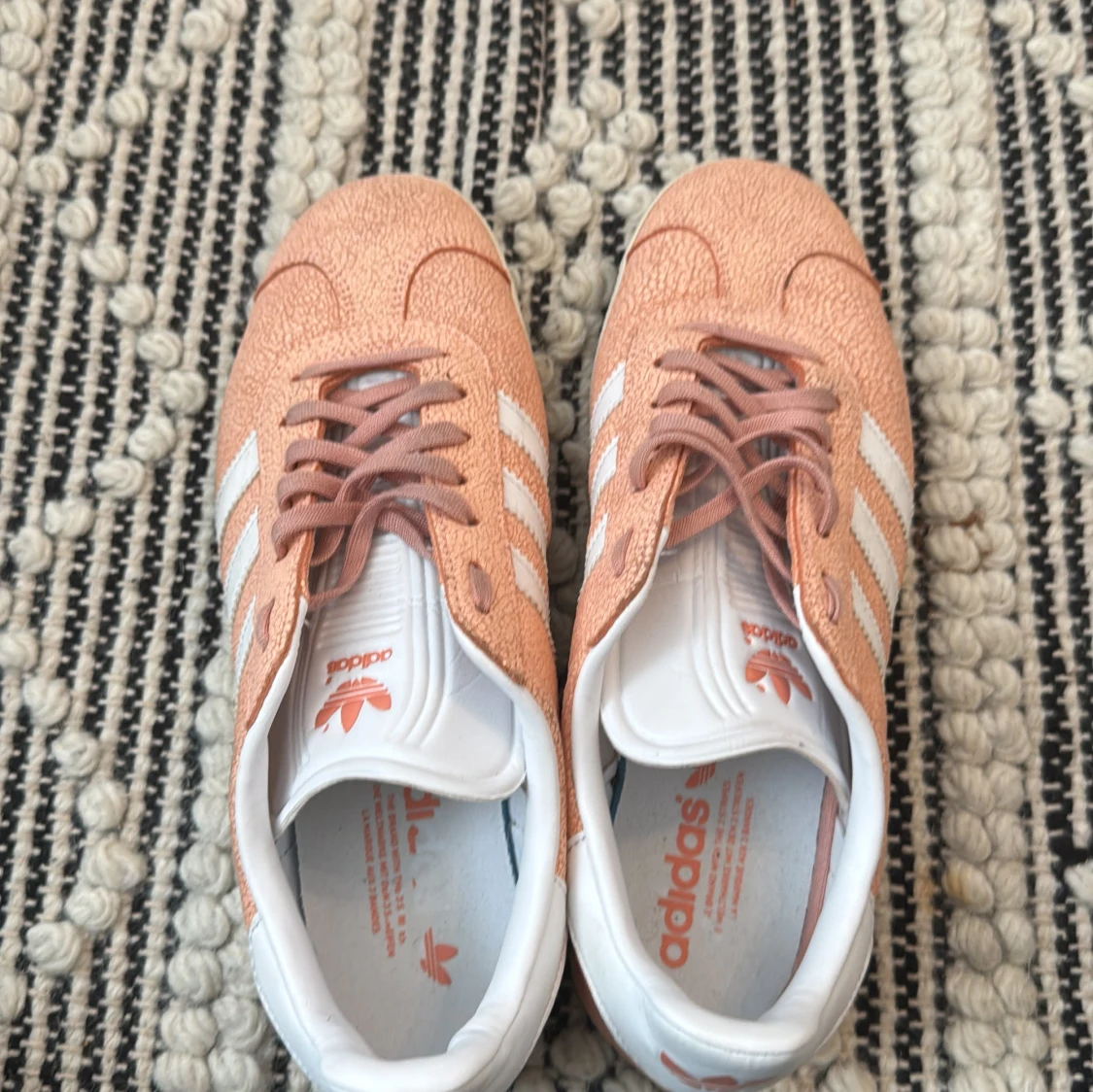Säljer ett par Adidas Gazelle sneakers i en snygg ljusrosa färg med vita detaljer och klassiska tre ränder på sidan. Ovandelen är i mocka och skorna har snörning samt vit sula. Perfekta för dig som vill sticka ut med en unik färg på dina sneakers.